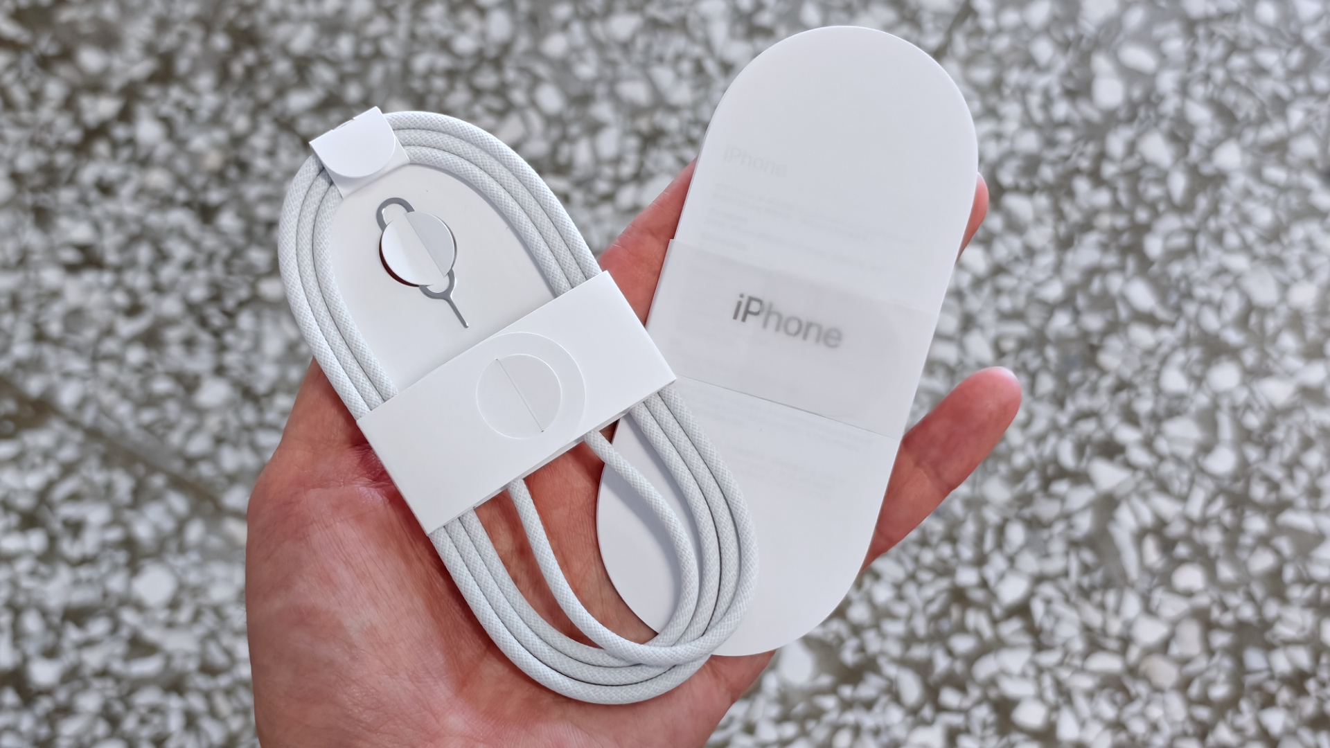 iPhone 17 Pro Max 配件包括編織 USB-C 傳輸線、退卡針、說明文件,沒有 Apple Logo 貼紙,也沒有充電器,主打的就是簡約愛地球。