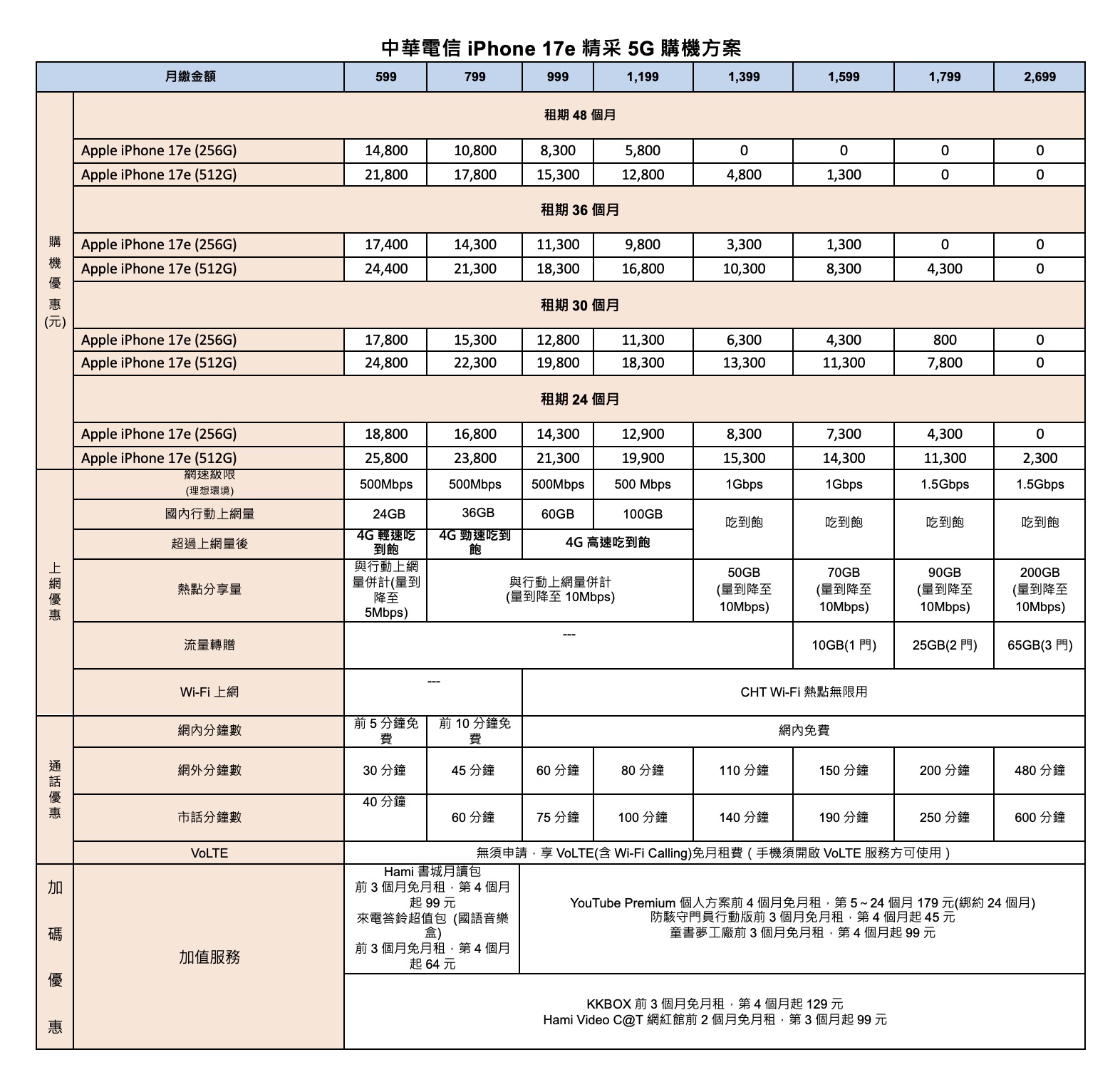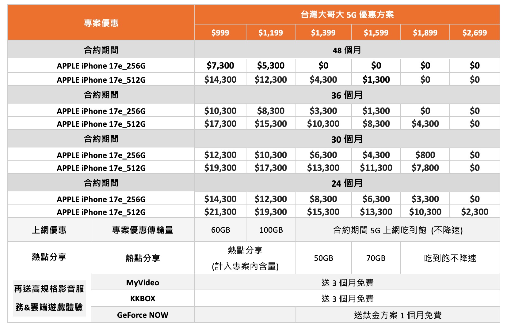 此外,申辦 999 元以上資費的用戶,還能享有 YouTube Premium、KKBOX 等多項加值服務的免月租優惠。