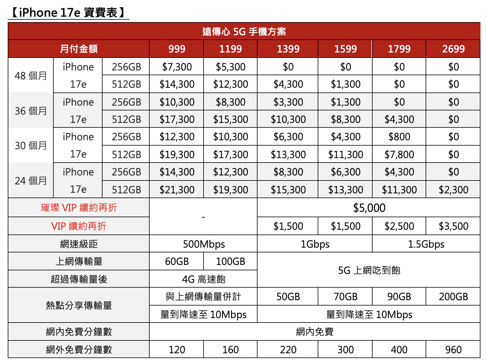 遠傳電信的方案主打長約期的購機折抵與完整的數位服務體驗;消費者若選擇月付 1,399 元的 5G 方案並綁約 48 個月,即可直接將 iPhone 17e 256GB 以 0 元入手,若對儲存空間有較高需求,升級至 512GB 版本在同為 1,399 元、48 個月合約的條件下,專案價則為 4,300 元,針對 VIP 用戶,遠傳同樣提供續約最高再折 5,000 元的專屬優惠。