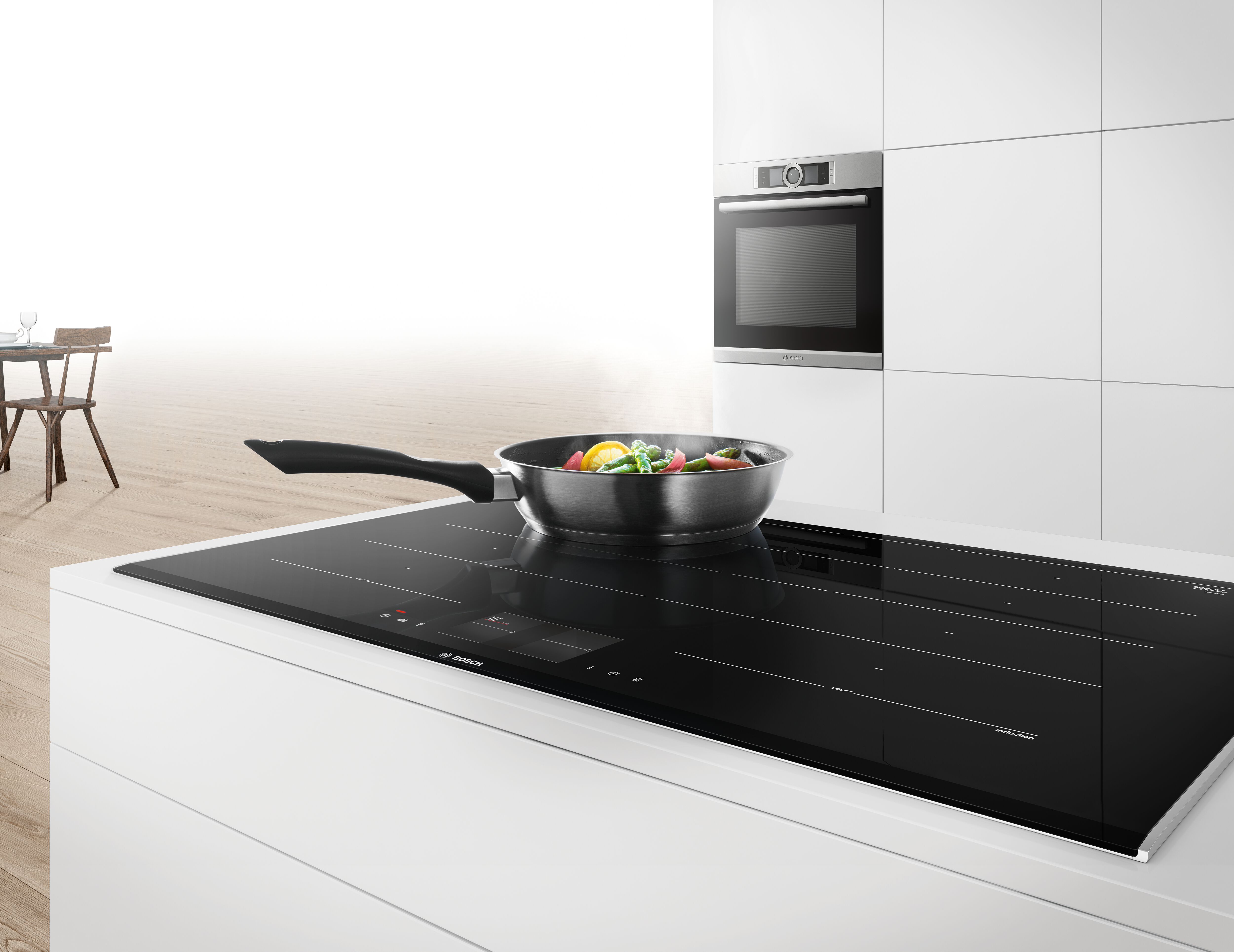 中式料理講究火候與速度,Bosch Flex IH 智慧感應爐 以最高 7,400W 瞬間大火力與 17 段火力控制精準應對,感應加熱僅在鍋底產生熱能,不僅安全節能,也能有效縮短烹調時間近一半;FlexZone 彈性烹調區可自動偵測鍋具大小並調整加熱範圍,輕鬆實現同時兩鍋快炒仍能均勻受熱。