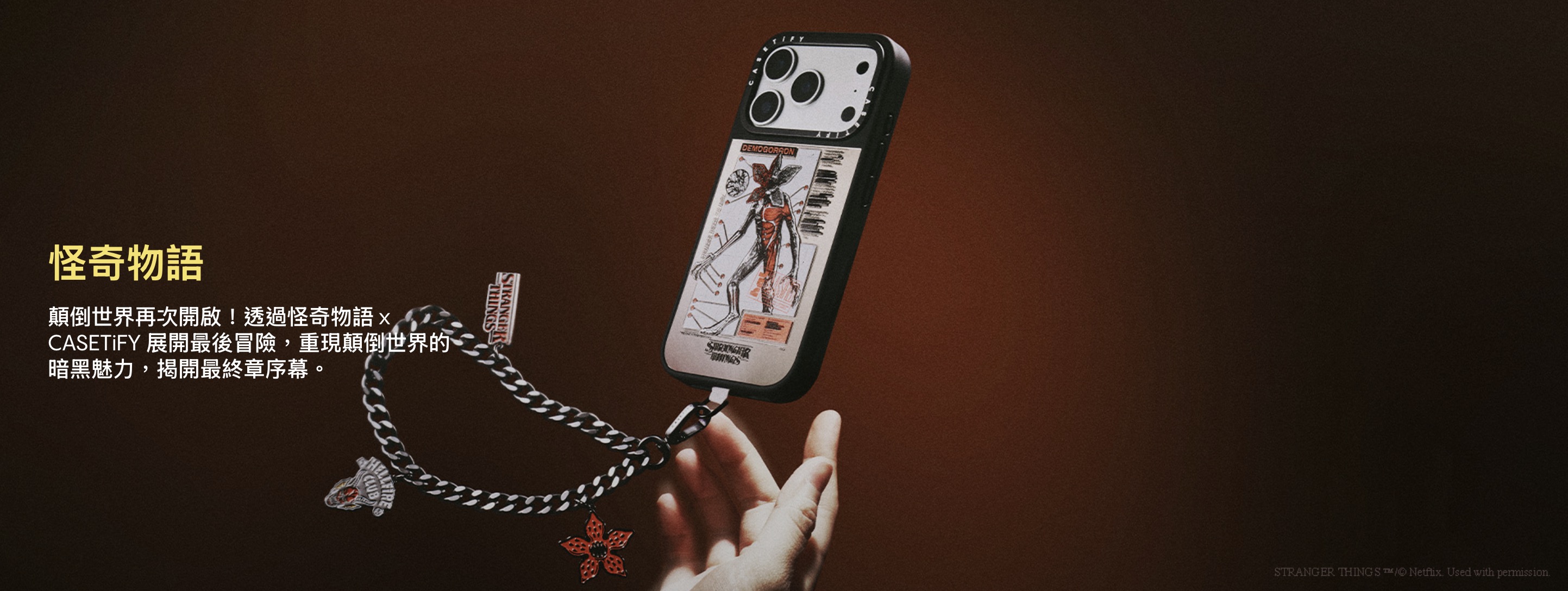 迎接 Netflix 熱門影集《怪奇物語》第五季,CASETiFY 攜手推出最終篇章聯名系列;設計以影集中的 1980 年代復古氛圍與象徵性圖像為靈感,融入「顛倒世界」元素,並刻畫劇中怪物、秘密社團與角色羈絆等主題。