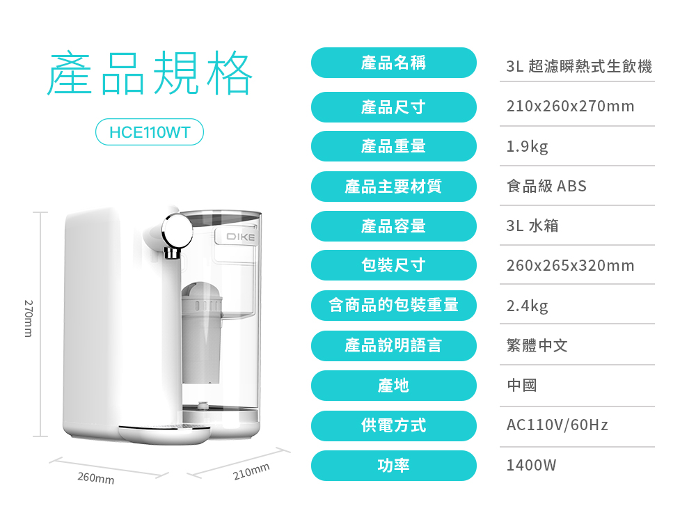 DIKE 超濾瞬熱式生飲機結合了熱水壺、開飲機、濾水壺、快煮壺、泡茶機、泡奶機等功能,免安裝隨插即用設計;具備 3 公升的儲水箱,並有可直覺操作的 LED 面板,能切換 3 秒瞬熱出水,支援 25 度開水、45 度泡奶、85 度咖啡、95 度泡麵四段溫控,並有 150ml 茶杯、230ml 玻璃杯、300ml 馬克杯、500ml 保溫瓶四段水量。