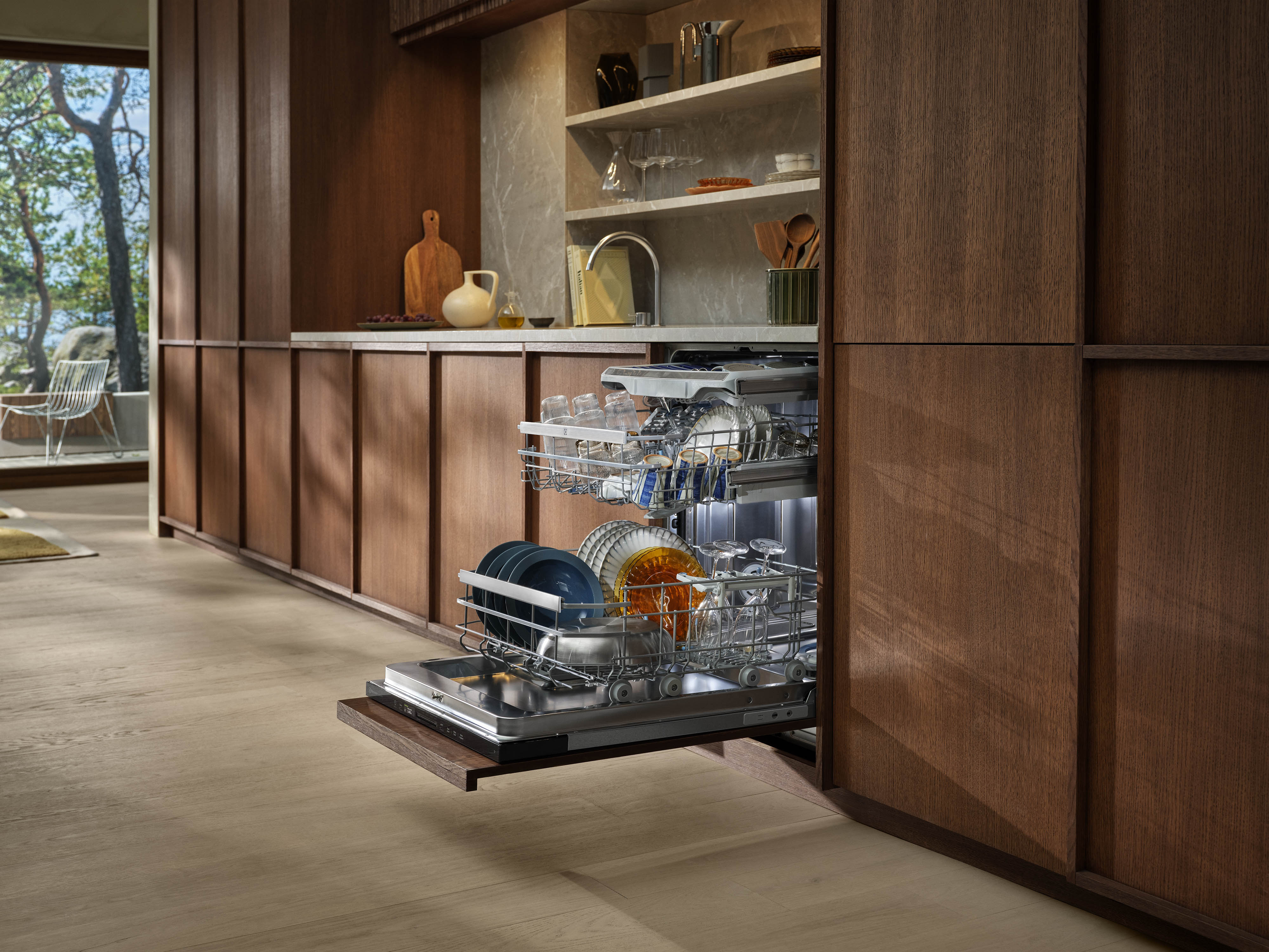 在洗滌設備方面,獲得 iF 設計獎肯定的洗碗機搭載了 QuickSelect 快易選介面,直覺的設計能同時顯示剩餘時間與節能指標。搭配 35 分貝的極靜音運行模式、輕觸開門與滑順的碗籃設計,讓大型烤盤或細緻玻璃杯的洗滌過程都變得更加安靜且不費力。
