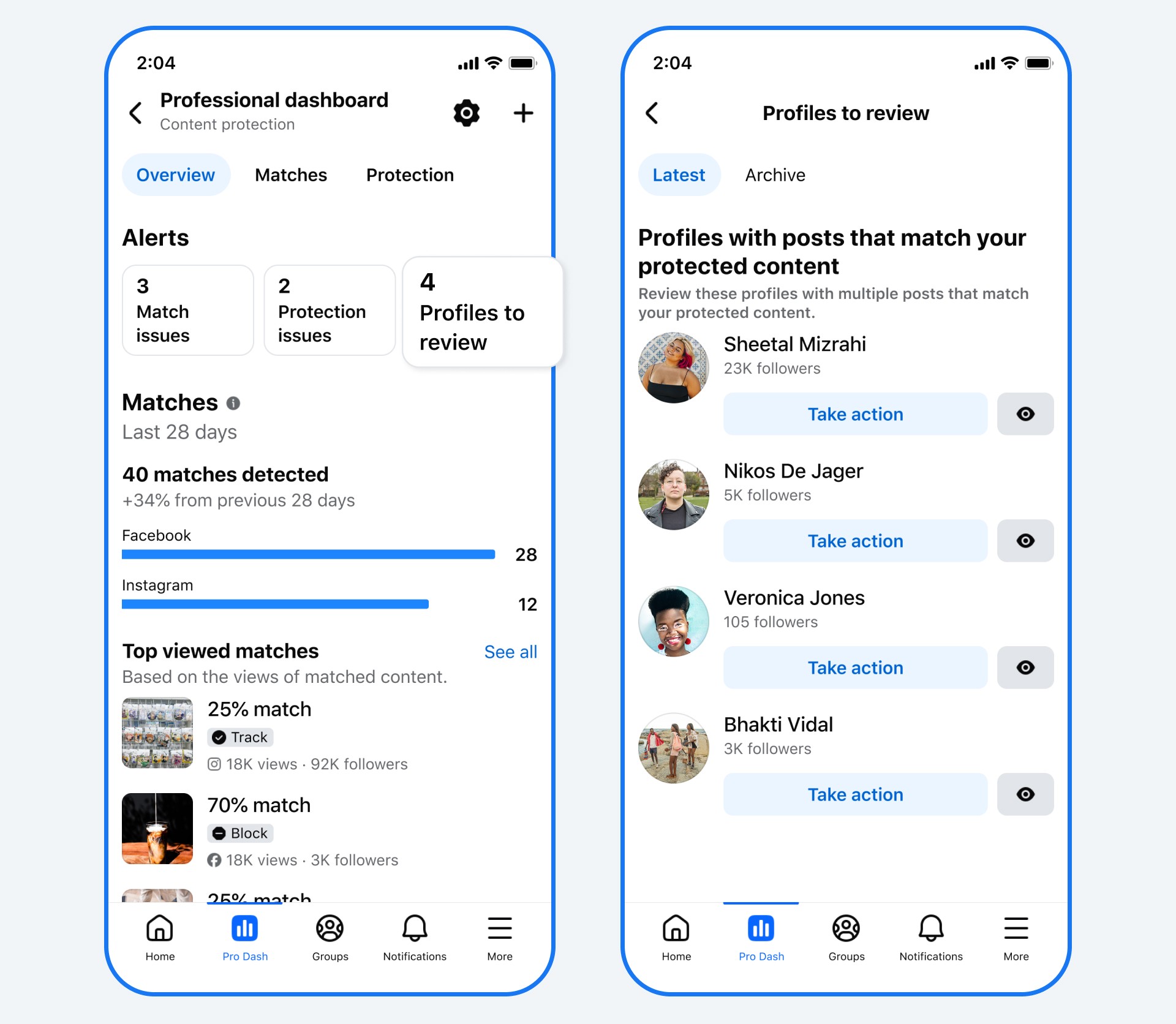除了從演算法層面著手,Facebook 也開發了實用的防盜機制來守護創作者的智慧財產權;自 2025 年推出內容保護功能後,系統已能自動保護創作者的原創 Reels,一旦偵測到平台上出現雷同的盜用影片,原創者第一時間就能採取追蹤、封鎖或要求下架等行動。