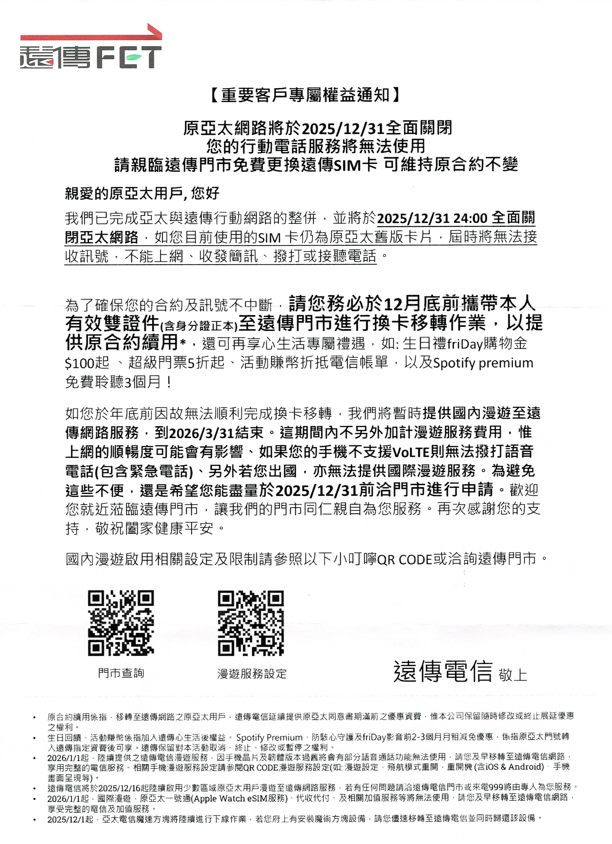 遠傳電信再次提醒,為避免上述不便,建議用戶盡量於 2025 年 12 月 31 日前完成申請;原亞太用戶僅需攜帶「本人有效雙證件(含身分證正本)」就近前往全台遠傳門市,即可免費進行換卡移轉作業。