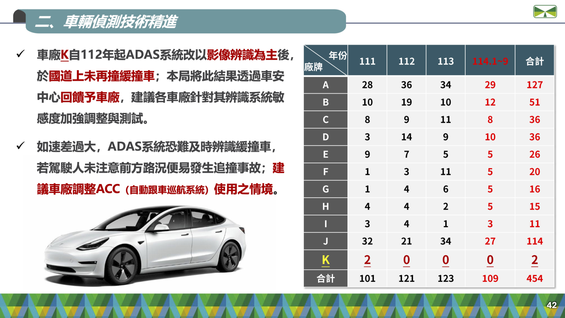 在研討會的數據分析中,最受矚目的焦點在於被代稱為「K 車廠」的數據變化;雖然沒有明確講出品牌,但明眼人不難看出那就是電動車大廠特斯拉(Tesla);高公局指出,該車廠自民國 112 年(2023 年)起,將其 ADAS 系統的偵測邏輯進行重大變革,改為以「純影像辨識」為主後,在國道緩撞車的撞擊表現上繳出了驚人成績單。