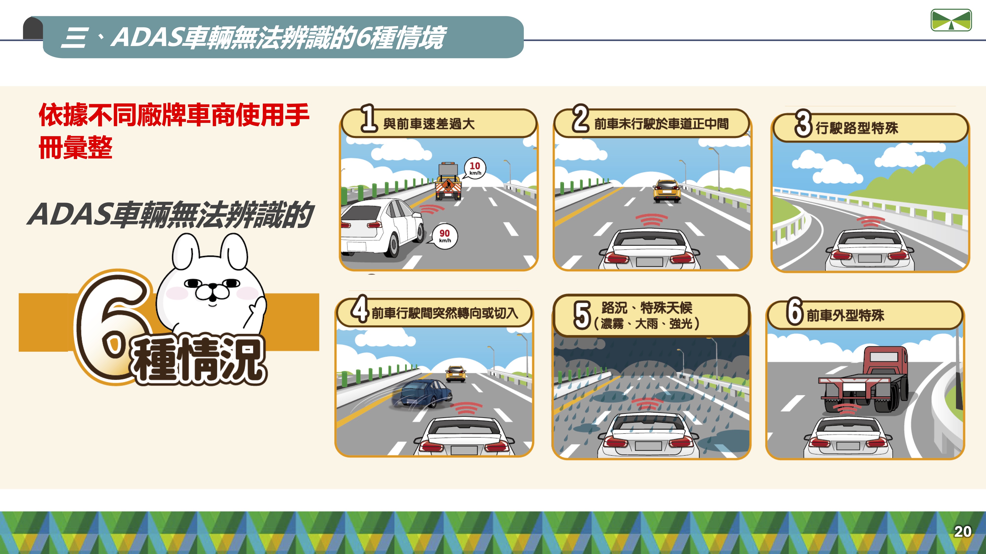 除了技術面的精進,研討會中也特別針對物理限制提出警示;高公局強調,即便輔助系統再先進,若車輛與前方緩撞車的「速差」過大,系統仍可能面臨物理極限。