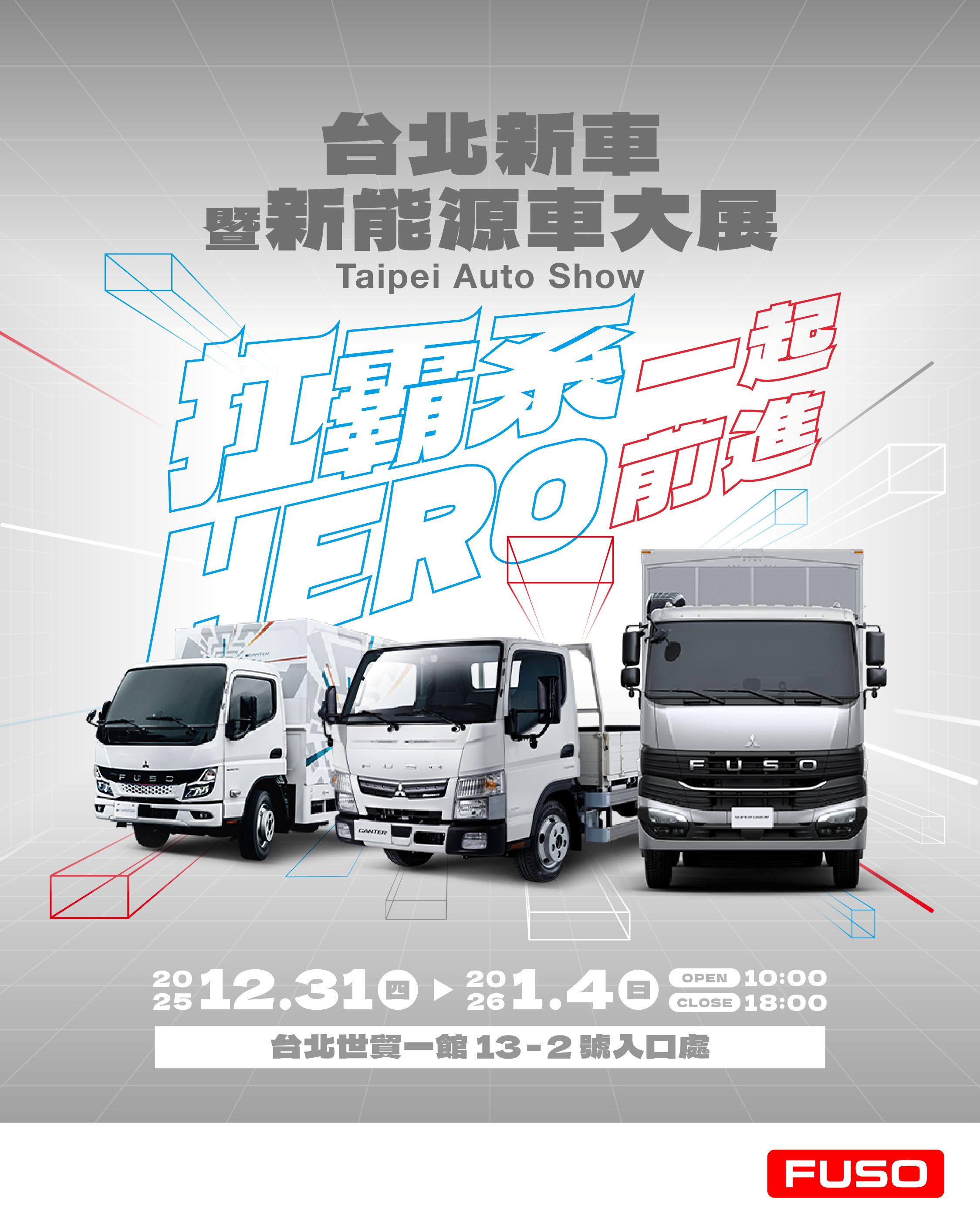 睽違兩年的車壇盛事「2026 台北新車暨新能源車大展」即將登場,台灣商用車領航品牌 FUSO 宣佈將於 2025 年 12 月 31 日至 2026 年 1 月 4 日,連續五天進駐臺北世貿中心一館;這次 FUSO 以「強大驅動偉大」為核心主題,不僅將位於 13-2 號入口處的展區打造為運輸新勢力基地,更一口氣展出旗艦重卡 New Super Great、全台唯一 5 噸電動輕型貨卡 eCanter 以及國民貨車 Canter 堅達三大主力車系,並邀請「樂天女孩」輪番現身應援!
