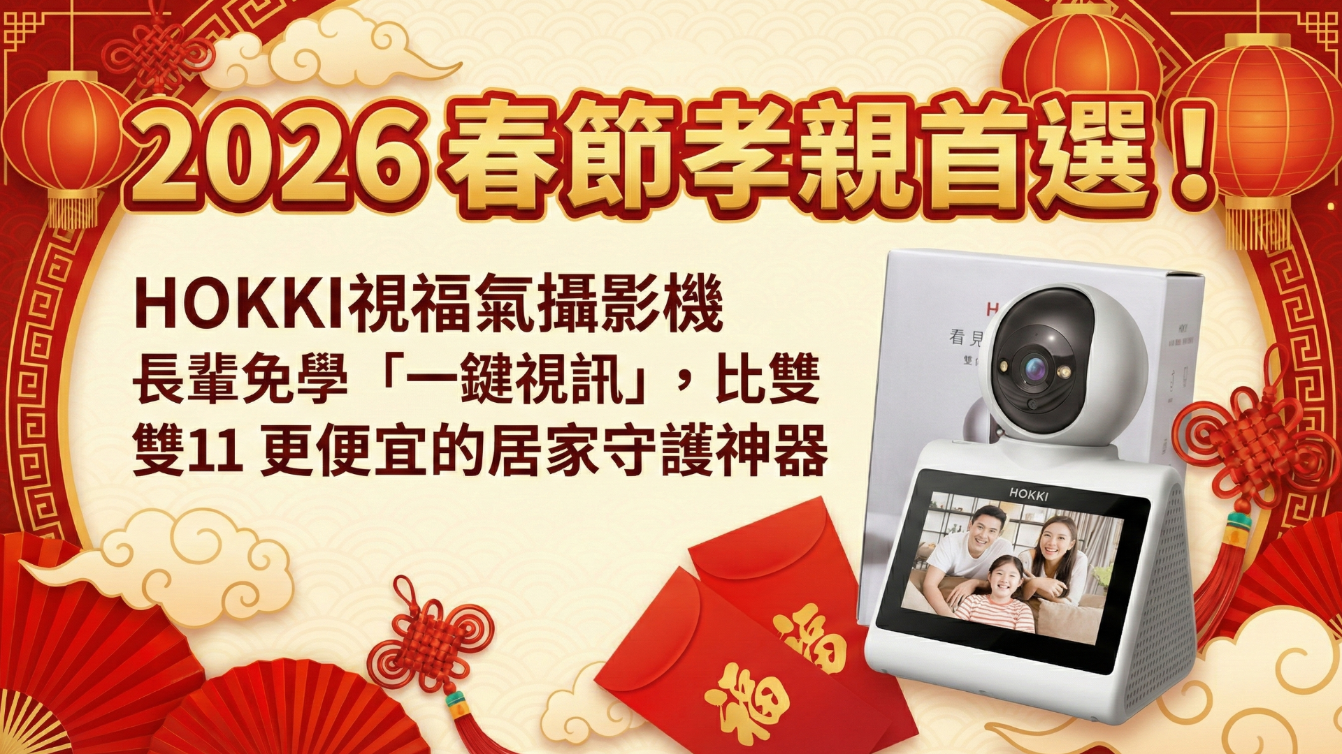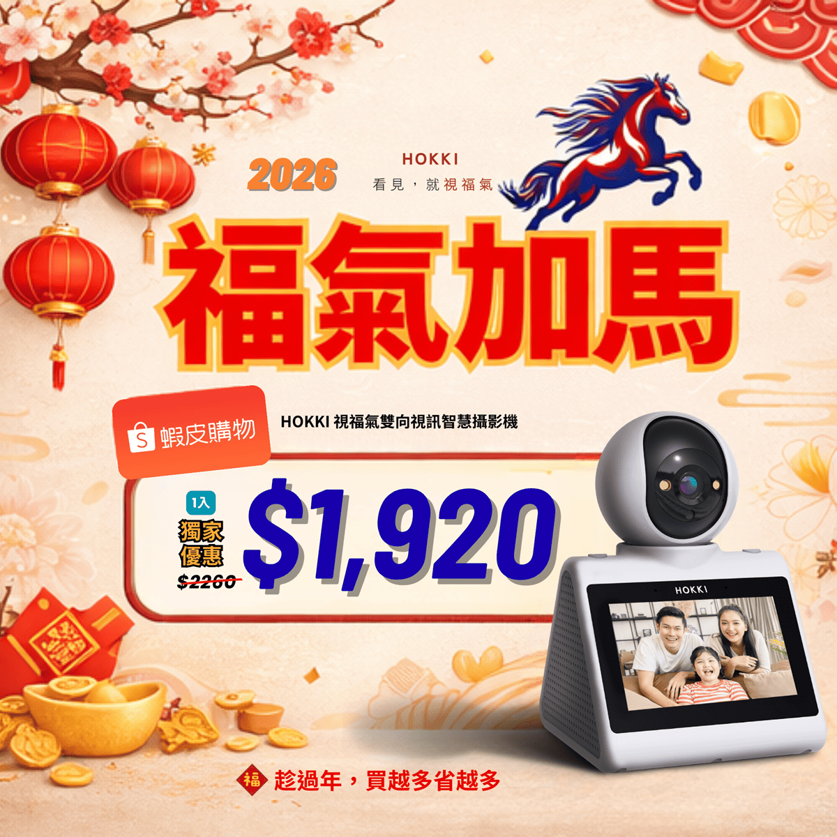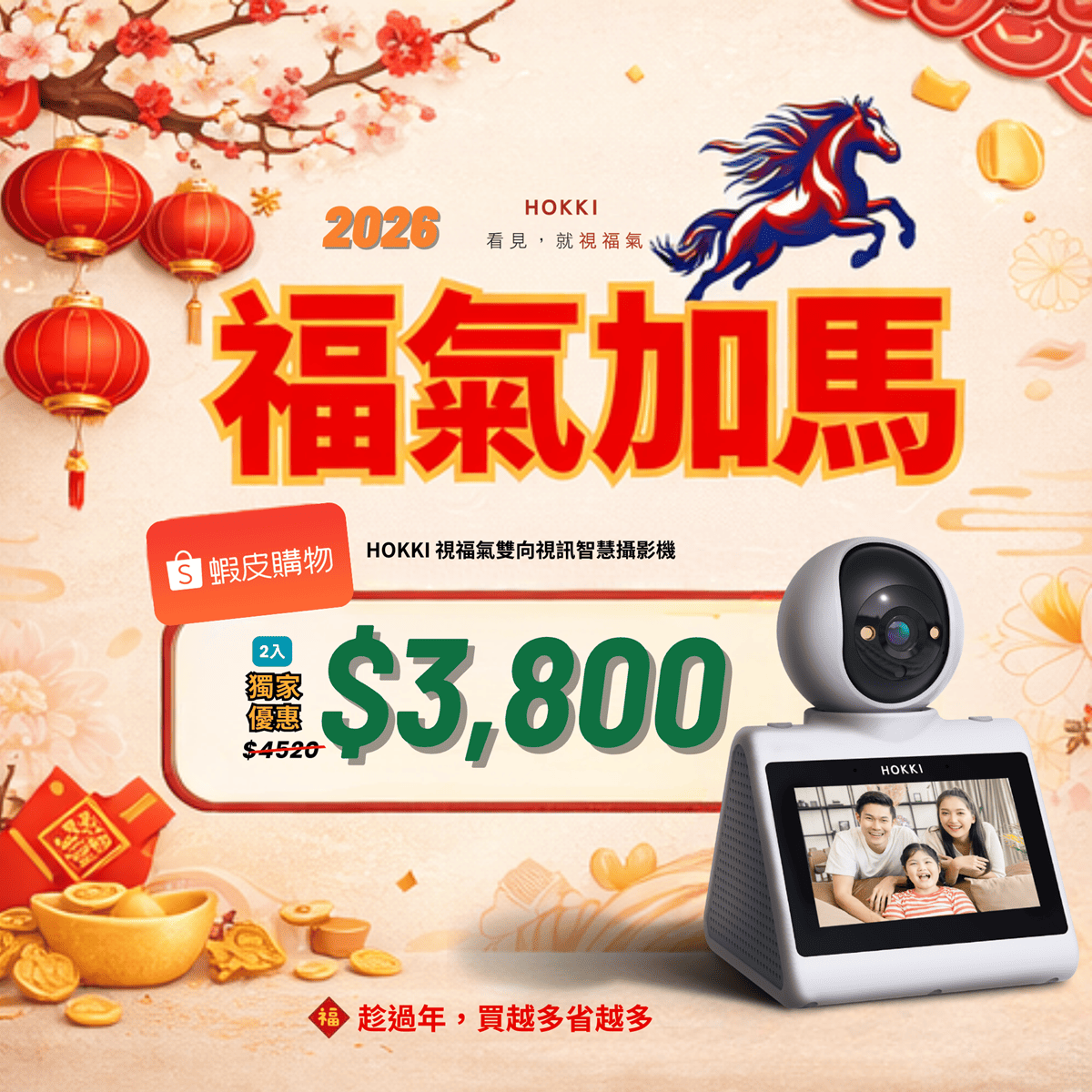 農曆新年是團圓的時刻,但在這個快節奏的時代,為了夢想在外打拚的遊子們,未必都能時刻陪伴在父母身邊;迎接充滿活力的馬年,最好的禮物不只是紅包,更是一份能讓家人隨時「看見」彼此的安心;2026 年新春,HOKKI 視福氣雙向視訊智慧攝影機特別推出比雙 11 還便宜的獨家回饋,要讓這份溫暖的科技,成為連接親情最堅固的橋樑。