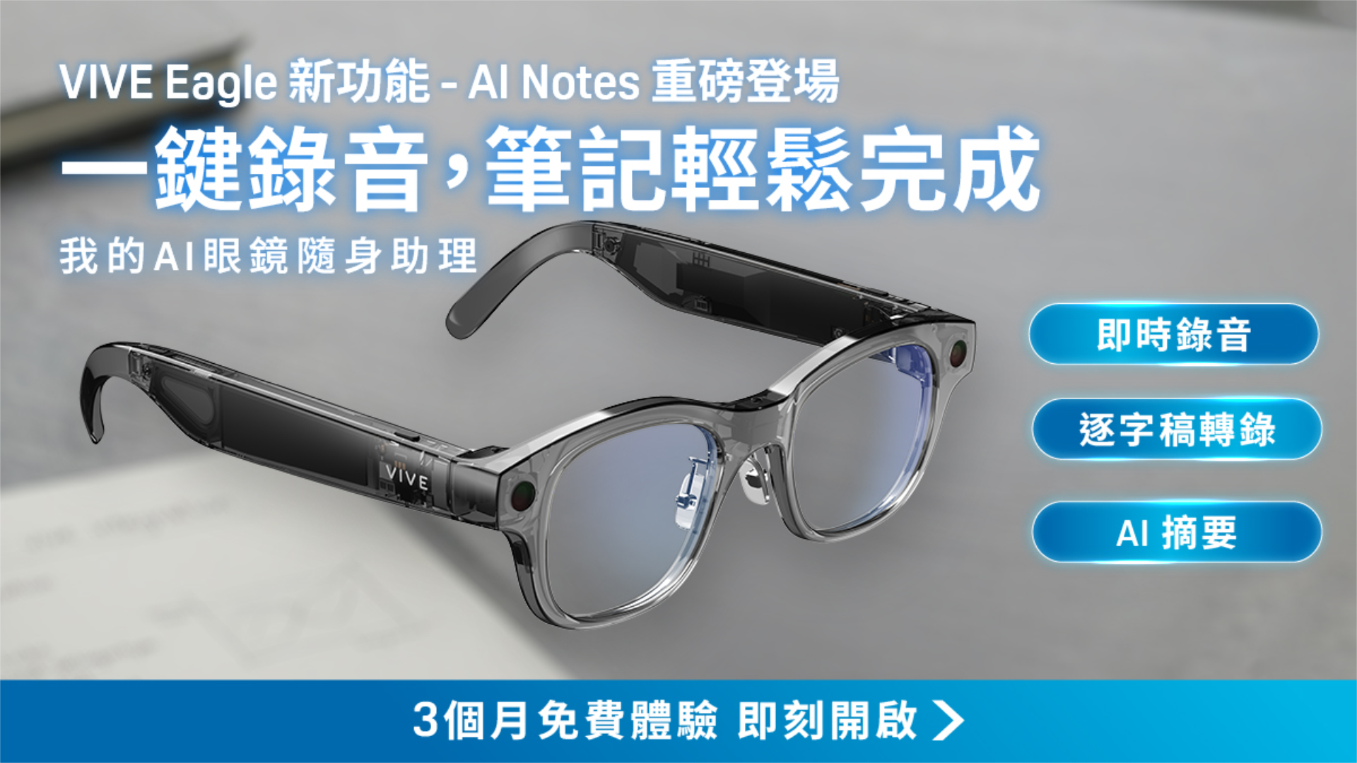 HTC 今(31)日宣布針對旗下 AI 智慧眼鏡 VIVE Eagle 釋出軟體更新,強化語音記錄、資訊整理及智慧互動體驗;本次更新的最大亮點為推出全新「VIVE AI Notes(AI 語音摘錄)」功能,並同步帶來多項系統操作優化,以及開放全體用戶 3 個月的免費試用方案。