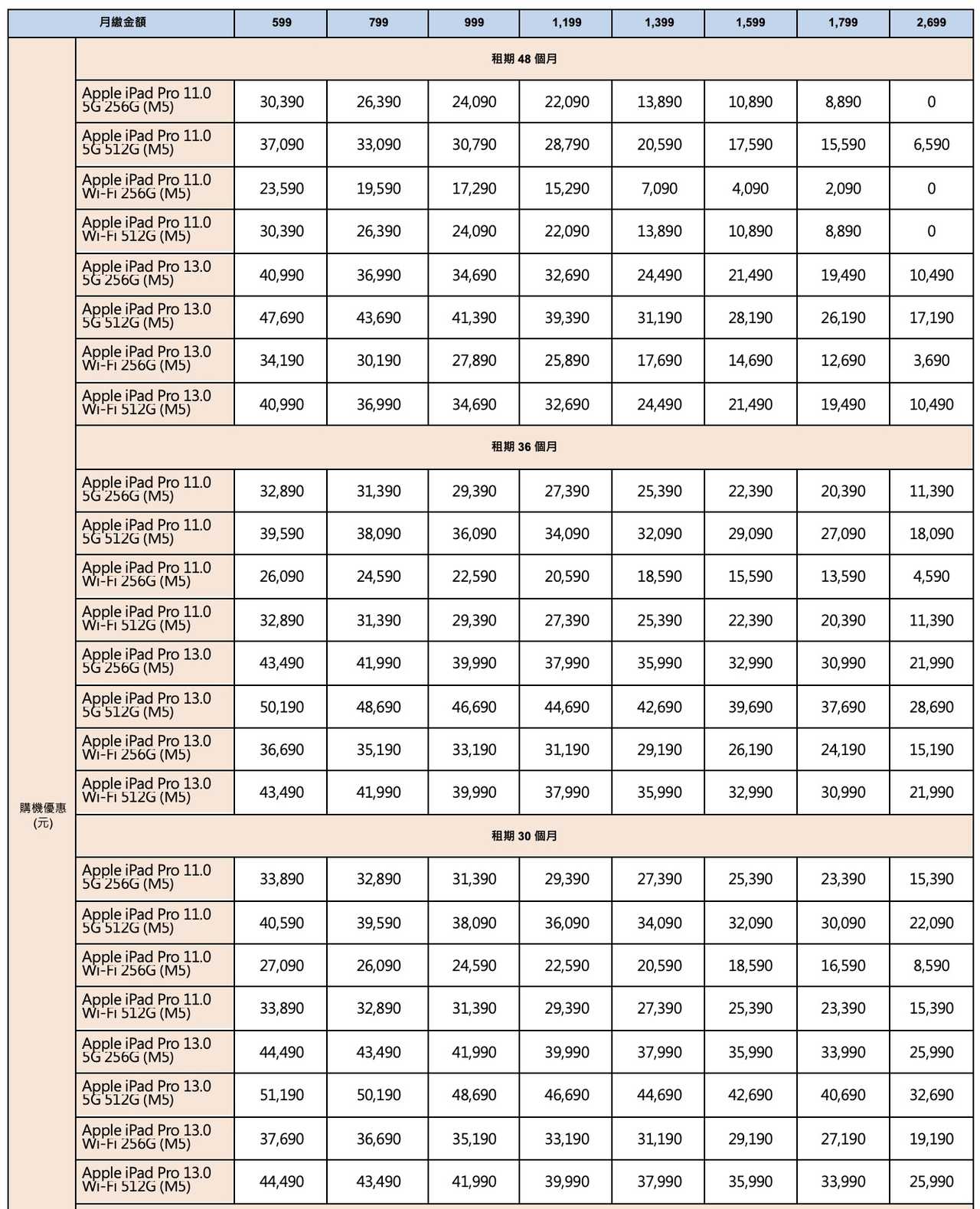 消費者若在 2026 年 1 月底前購買 iPhone 17 並申辦指定資費,將獲得額外的 Apple 購物金用於折抵 iPad Pro,透過「以機帶機」的策略鞏固高資費的 VIP 客戶,讓原本就有換手機需求的用戶,順勢將平板一併升級,適合預算充裕且追求「蘋果全家桶」的忠實用戶。