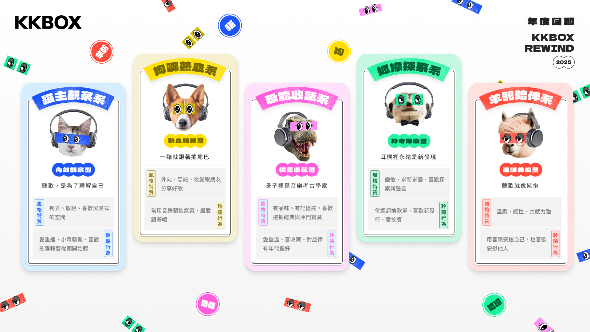 5 大「動物聽歌系」人格測驗:以趣味動物角色來對應您的聆聽個性,包括貓主觀察系、狗嗨熱血系、恐龍收藏系、狐獴探索系以及羊駝陪伴系;用戶可自由選擇最符合自己風格的頭像開啟回顧之旅,展現獨特的「音樂人格」。