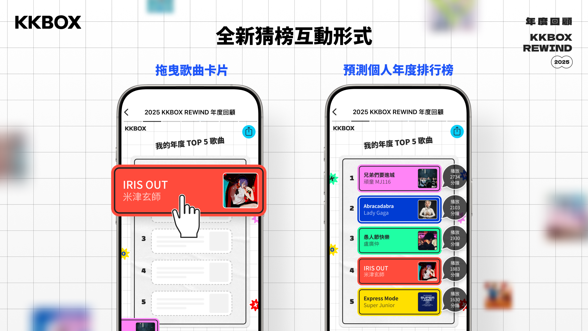互動式「年度 5 大歌曲」猜榜挑戰:不再只是被動看榜單;新增互動環節讓用戶在「我的年度 TOP 5 歌曲」頁面中,親自拖曳卡片預測排名,最後再由系統揭曉真實數據,看看您對自己的喜好有多了解。