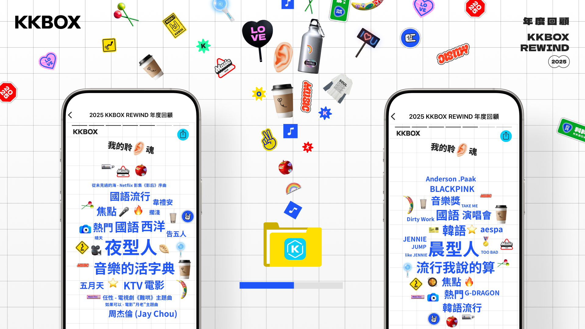 2025 年 11 月 24 日上線的「KKBOX REWIND 2025」將追星文化、音樂軌跡與生活元素融合;系統將把原本冰冷的聆聽數據,轉化為一頁頁時尚的拼貼風「音樂生活日誌」,帶領用戶從年度第一首歌出發,回顧四季熱播單曲,最終揭曉年度 5 大愛歌與 3 大本命歌手,重溫過去一年的音樂足跡。