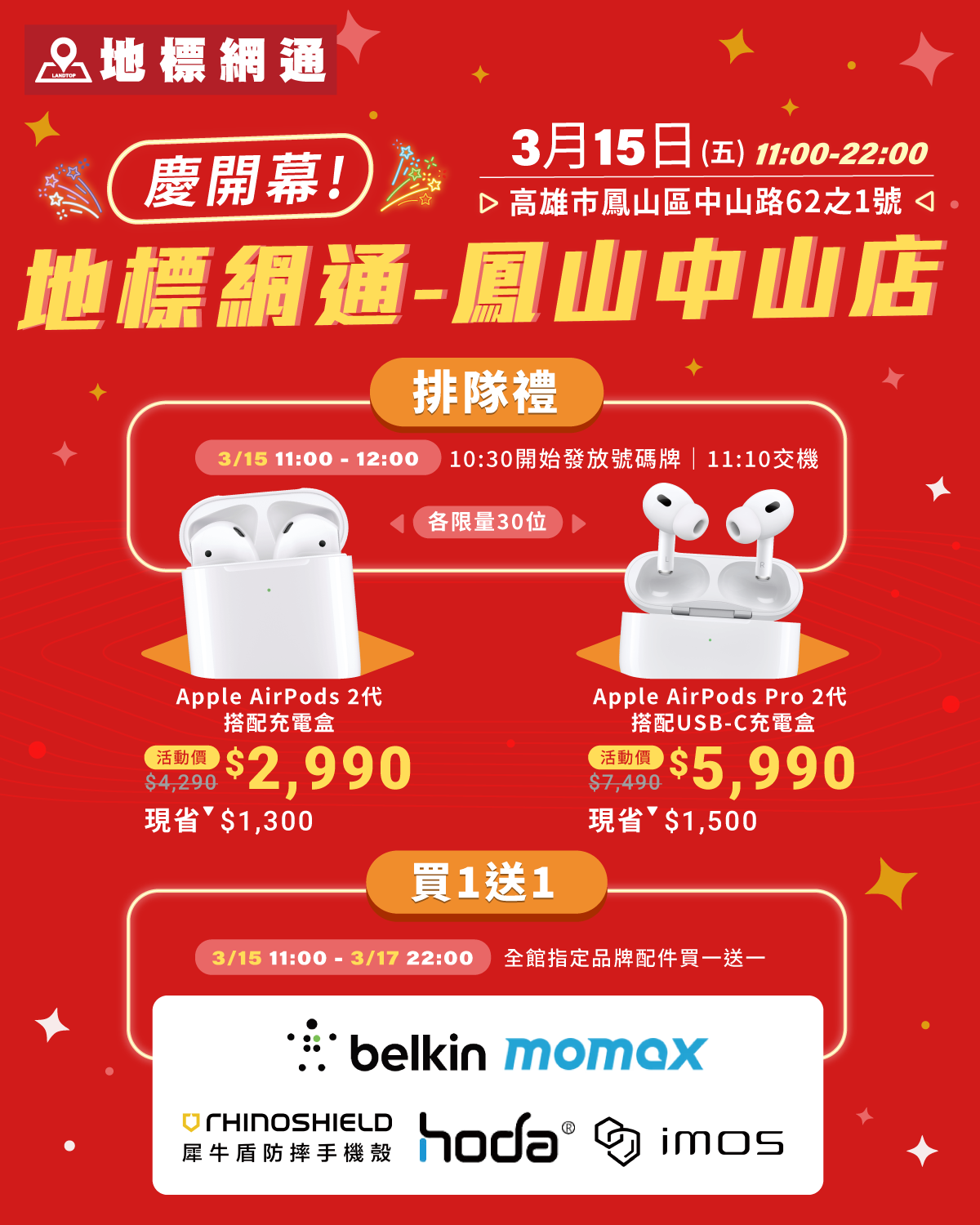地標網通高雄鳳山店開幕禮包含到店前 100 名顧客可免費獲得一串品牌衛生紙,並以 7 折限量提供 Apple AirPods 2 代、8 折限量供應 Apple AirPods Pro 2 代;當天購機或申辦門號,最低可以 9 元優惠價取得 Hoda Lightning / Type-C 傳輸線,Samsung ITFIT 五段式聲波電動牙刷也只要 299 元。