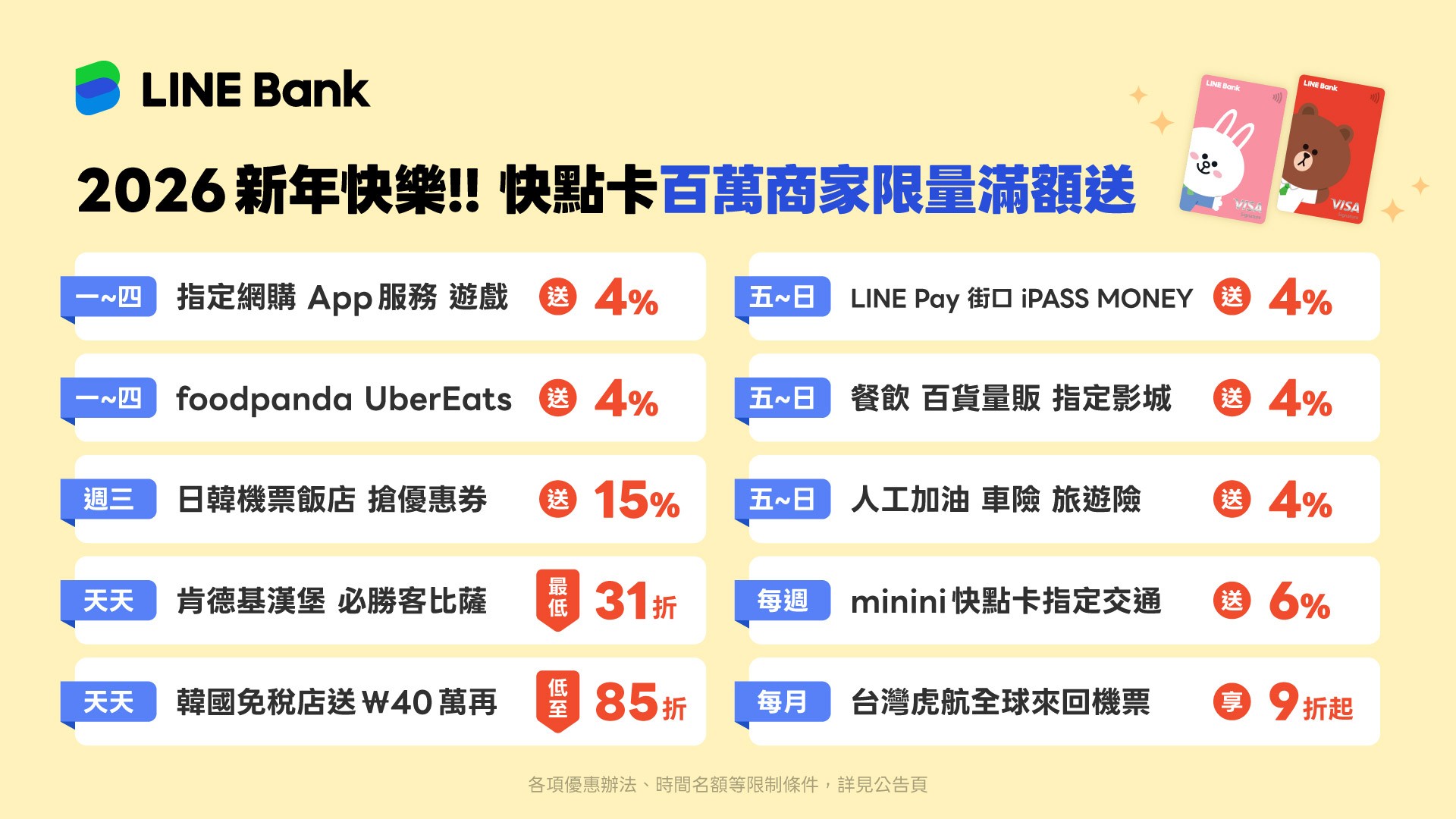 觀察此次 LINE Bank 的 2026 年首季策略,可以看出業者試圖用「分眾場景」來黏住消費者。對於習慣在平日週一至週四透過網購或外送解決生活所需的上班族與小資族,使用快點卡在蝦皮、momo 購物網,或是透過 foodpanda、UberEats 訂餐,皆能享有最高 4% 的回饋,直接鎖定日常高頻率的消費行為。