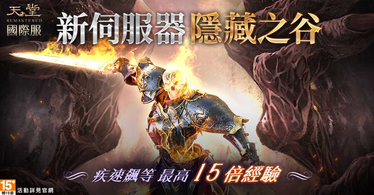 《天堂》推出全新伺服器「隱藏之谷」,提供歷年最高的 1,500% 經驗值加成,隱藏之谷所有玩家還將免費獲得「+7 魔族武器」與全套七件的「火焰之影防具箱子」,搭配豐盛的練功輔助物資,讓玩家擁有等級狂飆的激爽體驗;持有「火焰之影的成長加護」,還能額外再享有 EXP+500,四周即可衝等直上 Lv.90。