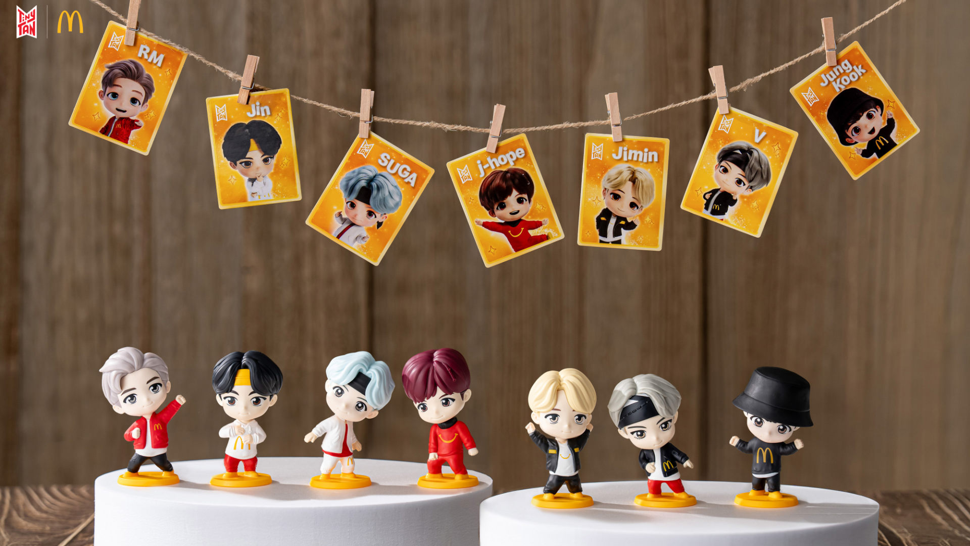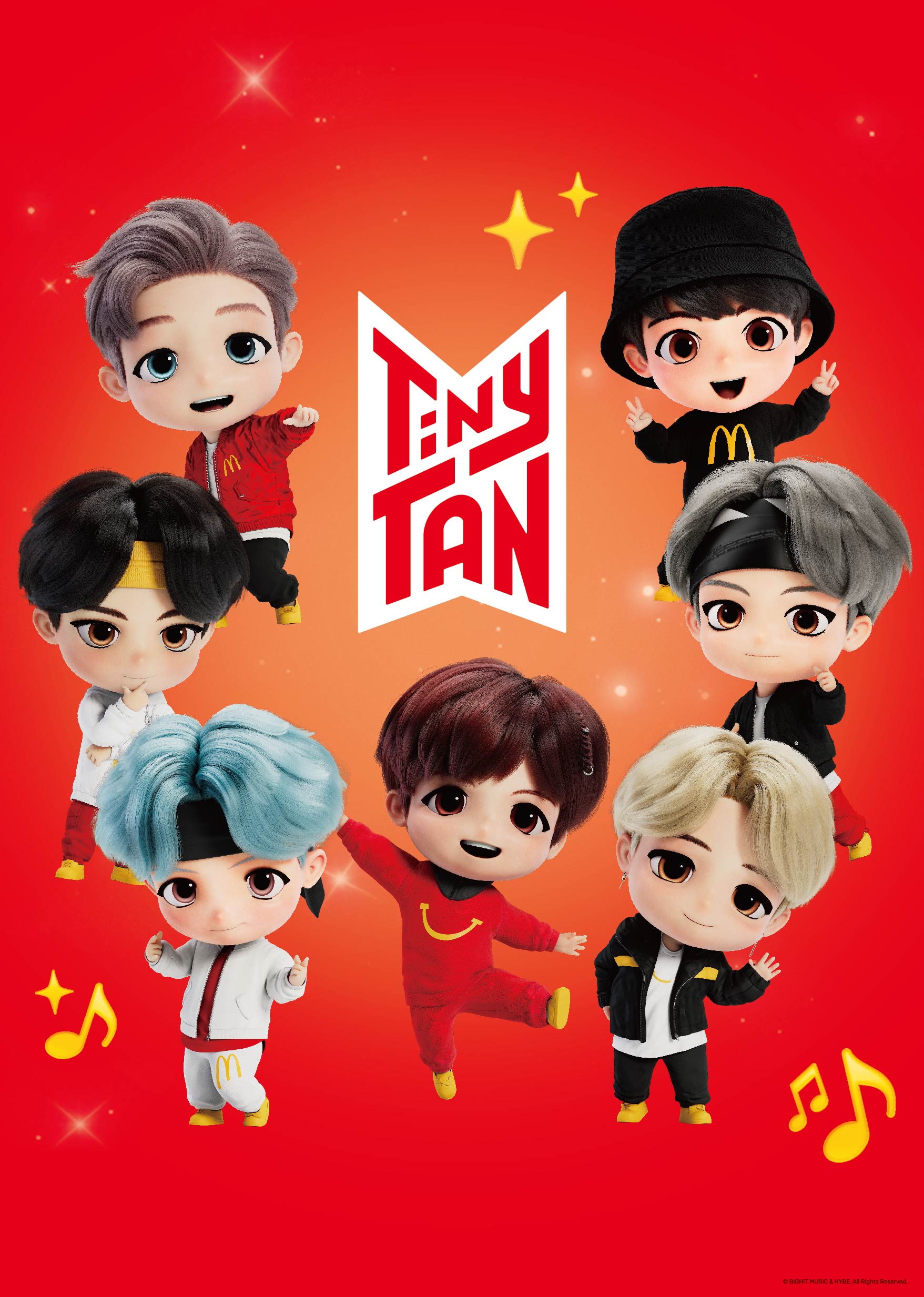 「TinyTAN」源自韓國天團 BTS 七位成員的化身角色,個性鮮明並蘊含粉絲熟悉的特質,這次 ENCORE 版公仔更特別換上結合麥當勞經典元素的服裝,讓品牌標誌與角色萌點巧妙融合;七位角色——RM、Jin、SUGA、j-hope、Jimin、V 與 Jung Kook——將全數同步登場,勢必再度掀起收藏熱潮。