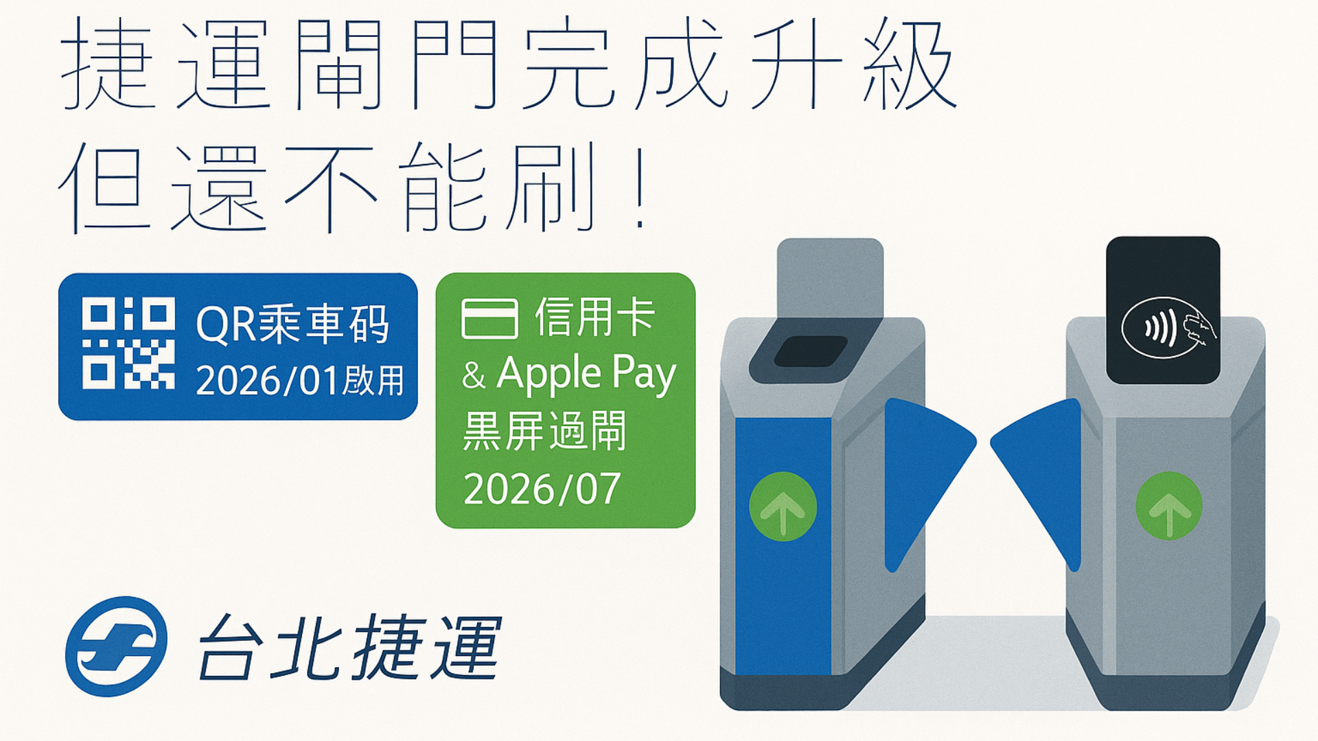 臺北捷運公司宣布「閘門電子主單元模組重置案」硬體建置已於 2025 年 10 月如期完成,但⋯⋯還不能用,其中 QR 乘車碼將自 2026 年 1 月起與公車系統同步開放使用,信用卡乘車服務則預計 2026 年 7 月上線!