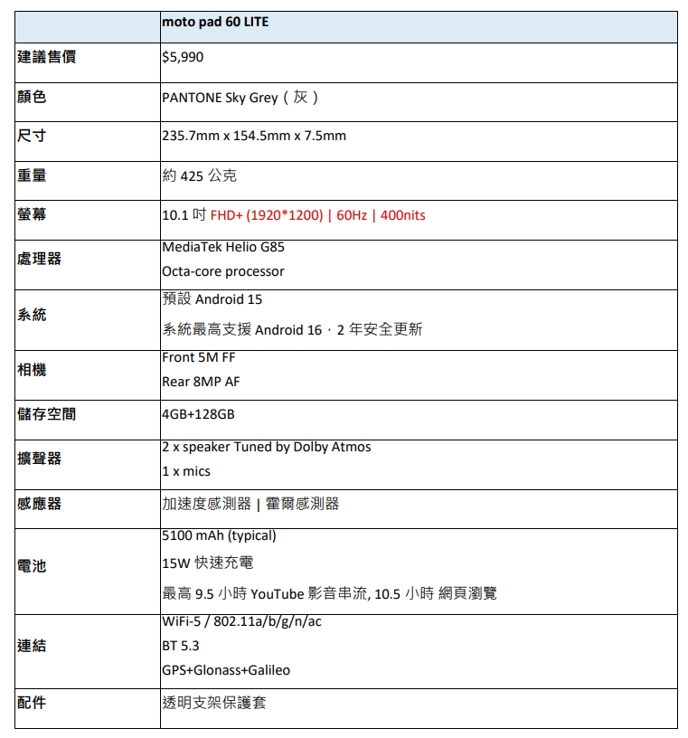 moto pad 60 系列包括 moto pad 60 NEO 與 moto pad 60 LITE 兩款機型,其中 moto pad 60 NEO 搭載 MediaTek D6300 處理器,配備 11 吋 2.5K 螢幕與 Dolby Atmos 四聲道揚聲器,續航力可達 12 小時,隨盒附贈 moto pen 手寫筆,外觀採用 PANTONE「Bronze Green」,建議售價新台幣 8,990 元,moto pad 60 LITE 則是相對入門,搭載 10.1 吋螢幕、Dolby Atmos 雙喇叭,內建 5,100mAh 電池,機身配色為 PANTONE「Sky Gray」,建議售價 5,990 元。
