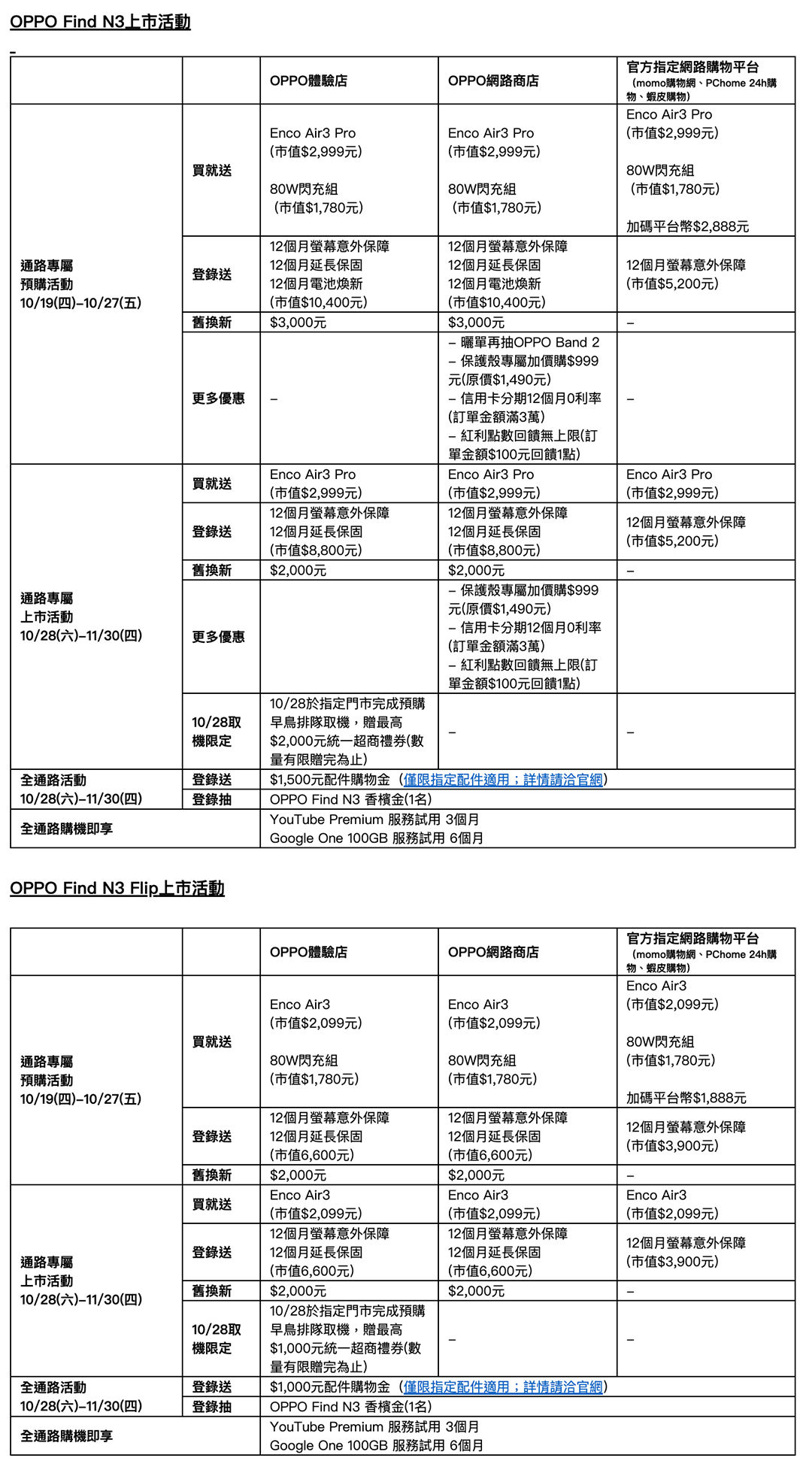 OPPO 即將在台灣推出 Find N3 系列新機,其中 Find N3 是 OPPO 首次在台灣推出的大螢幕摺疊機型;OPPO Find N3 與 Find N3 Flip 售價分別為 60,990 元、32,990 元,將於即日起至 2023 年 10 月 27 日於 OPPO 體驗店、OPPO 網路商店、momo 購物網、PChome 24h 購物、蝦皮購物、康是美網購 eShop、 7-ELEVEN i 預購、博客來、鮮拾網開放預購,並於 10 月 28 日起陸續於各大通路上市,於活動期間購買再贈 OPPO 原廠耳機配件、閃充組等多款專屬好禮,同時,還可享有 OPPO Find 系列專屬八大安心服務,多項好禮及服務總價值超過萬元。