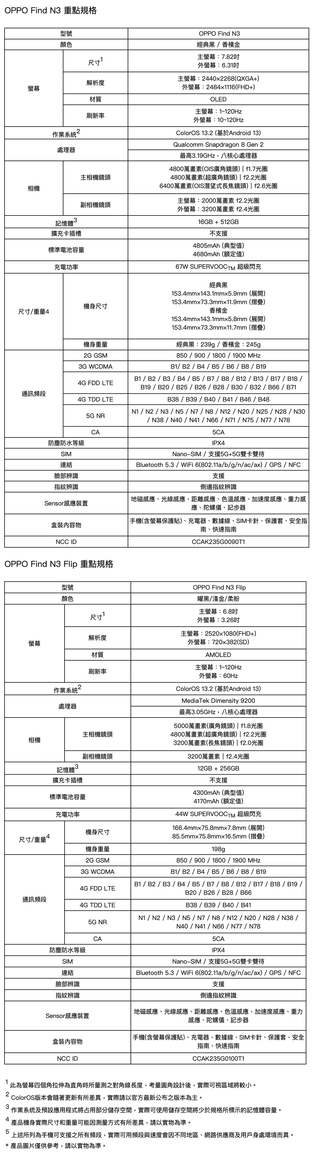 OPPO Find N3 展開後 7.82 吋,閉合時 6.31 吋,內、外螢幕解析度分別為 QXGA+ 與 FHD+,提供 2:9 外螢幕比例與便攜握感,重量為 239g;全新升級水滴轉軸設計,採用航太級承重結構,讓螢幕更無痕、堅韌耐用,並通過萊茵 TÜV 摺疊可靠度認證。