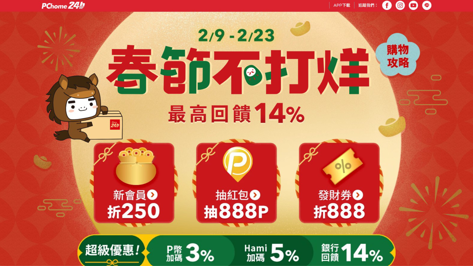 超速配年節照常出貨!PChome 24h 購物盤「春節不打烊」天天發財券狂折 888,最高回饋 14%