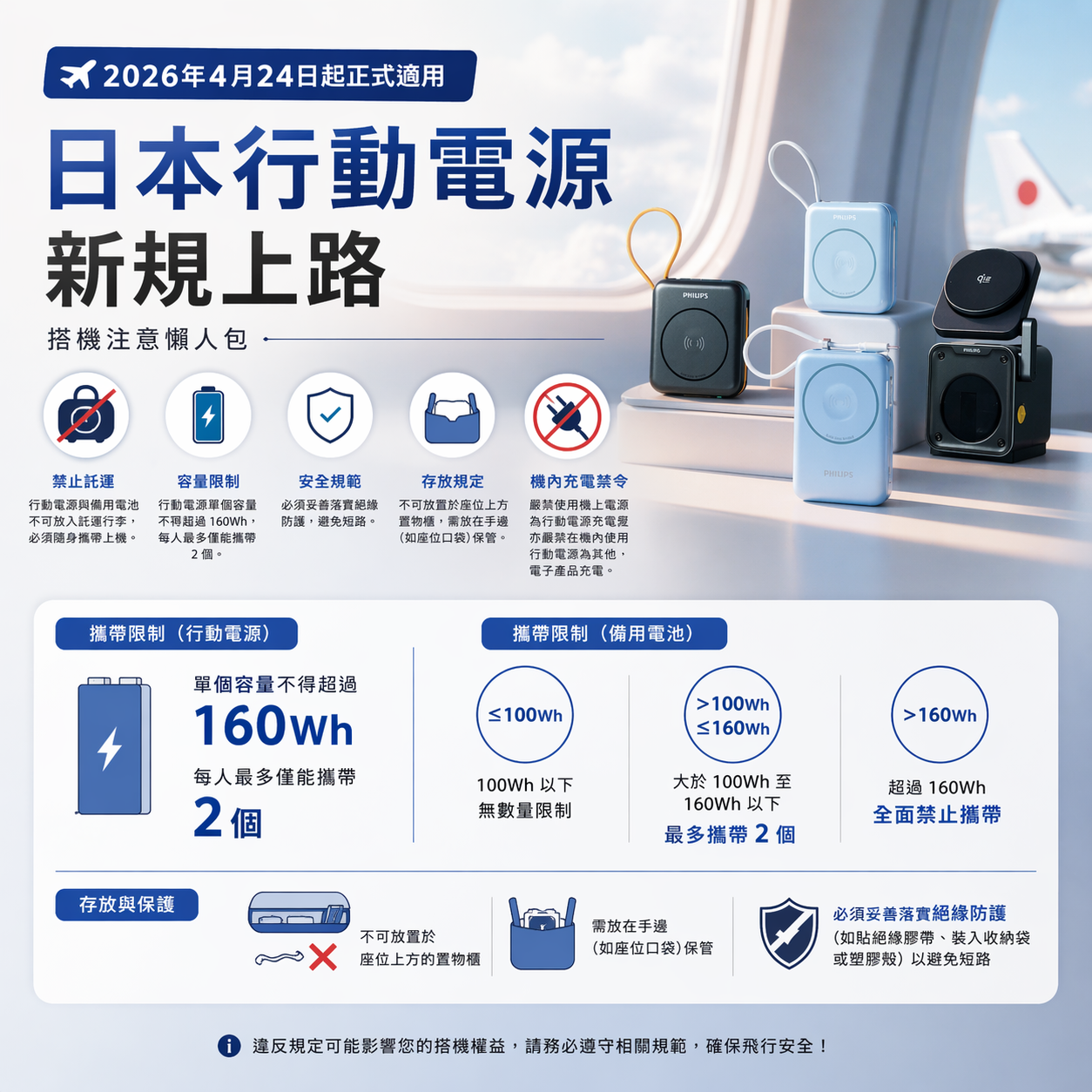 攜帶限制(行動電源):單個容量不得超過 160Wh,每人最多僅能攜帶 2 個。