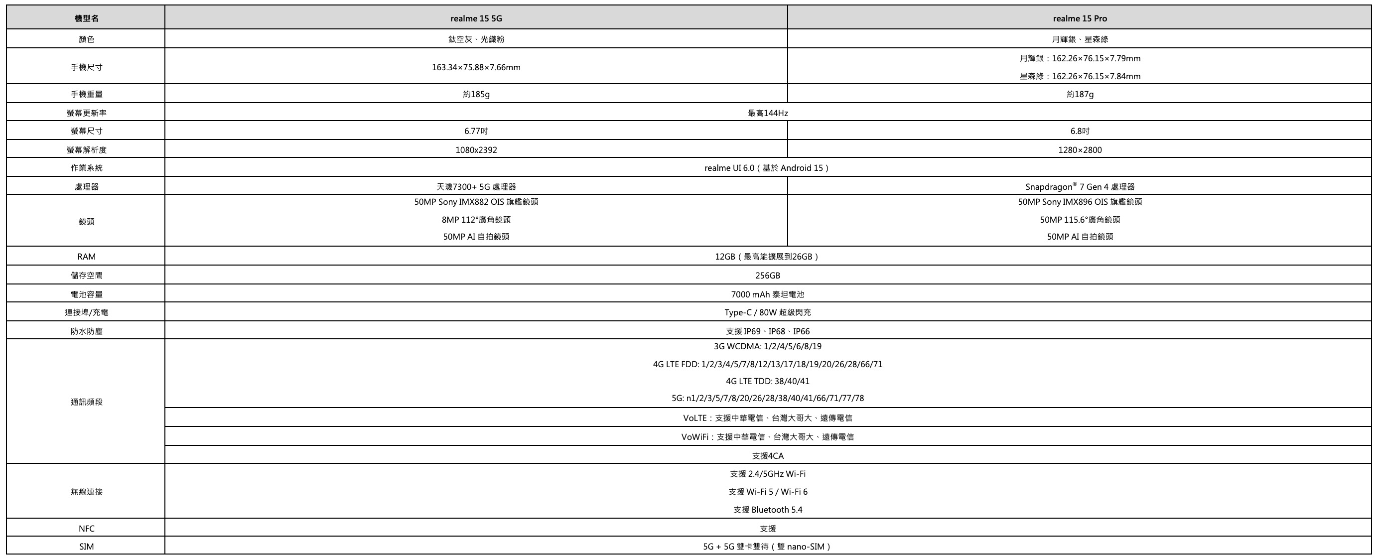 在價格與版本方面,realme 15 Pro 提供「月輝銀」、「星森綠」兩款配色,搭載 12GB + 256GB 容量組合,建議售價新台幣 13,990 元;realme 15 5G 則有「鈦空灰」、「光織粉」兩色,同樣為 12GB + 256GB 規格,售價 10,990 元。
