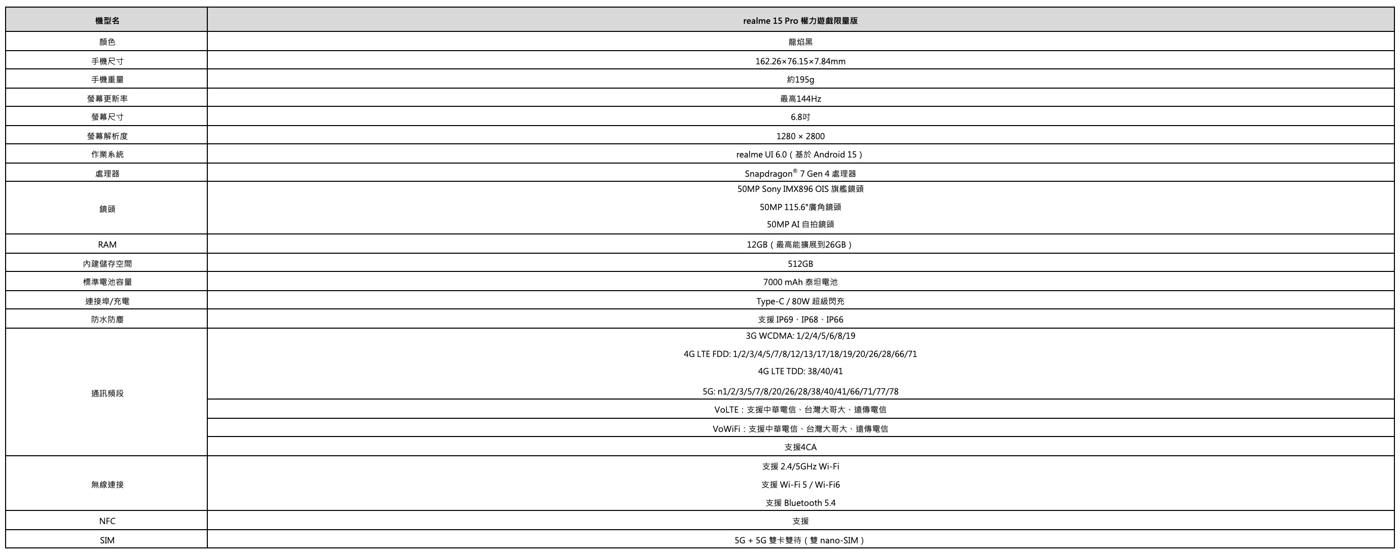 此次發表會亮點之一,是 realme 與華納兄弟探索全球消費品部聯手推出的「realme 15 Pro 權力遊戲限量版」,以「龍焰黑」為主色,12 GB + 512 GB 版本售價新台幣 15,990 元,全球限量 5,000 支;機背採用能隨溫度變色的皮革材質,搭配浮雕龍爪與金色家族銘文細節,展現冰與火共存的力量。