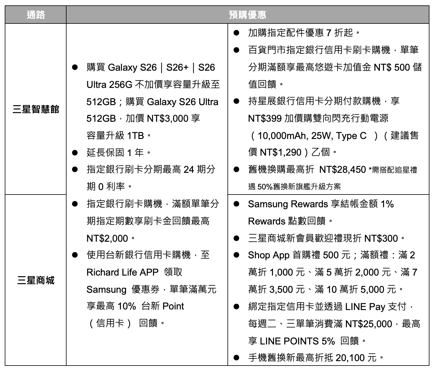 台灣三星自 2026 年 3 月 4 日 16:00 起至 3 月 11 日 23:59 止,展開指定通路的限量早鳥預購;消費者若於期間內預購並在 4 月 14 日前取機,即可享有不加價的容量升級優惠,購買 256GB 版本可免費直升 512GB,購買 Galaxy S26 Ultra 512GB 的消費者更加價 3,000 元即可升級至 1TB 頂規容量;預購期間加購 GalaxyBuds4 系列等指定穿戴裝置可享 9 折優惠,原 iOS 用戶亦享有跨系統 LINE 資料無痛移轉服務。