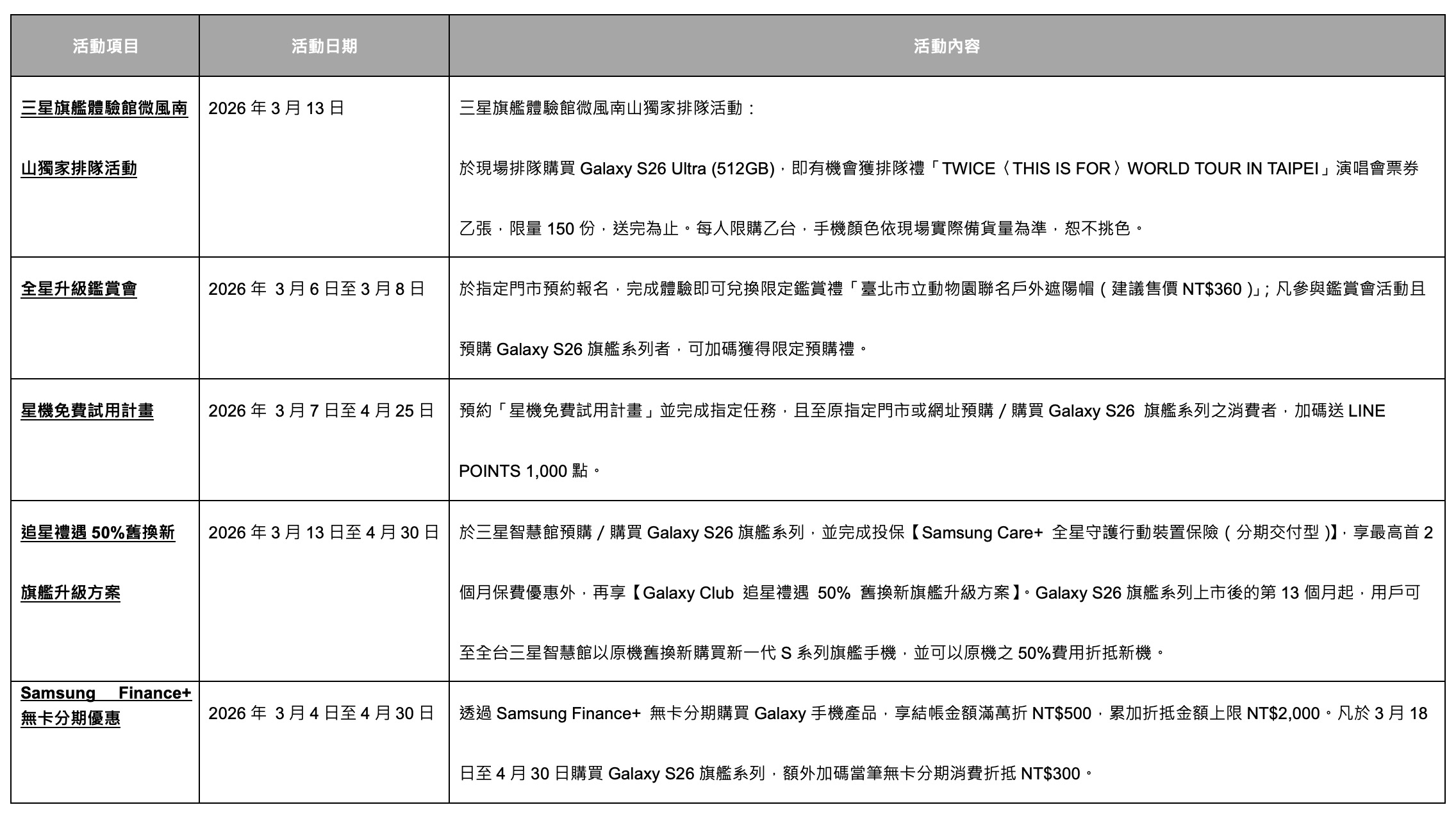 本次實體購機活動亦相當豐富,2026 年 3 月 13 日於三星旗艦體驗館微風南山將舉辦獨家排隊活動,現場購買 Samsung Galaxy S26 Ultra 512GB 限量 150 名,即可抽「TWICE〈THIS IS FOR〉WORLD TOUR IN TAIPEI」演唱會票券乙張。