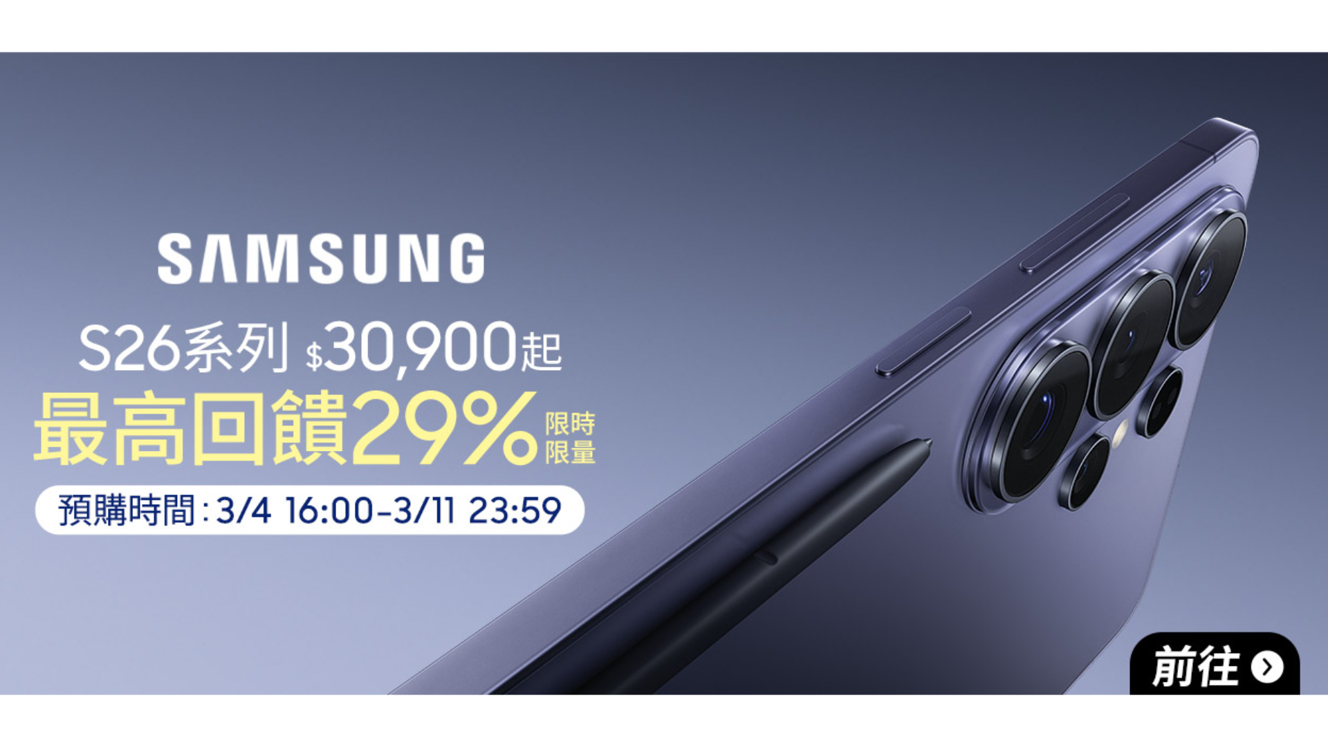 台灣三星自 2026 年 3 月 4 日 16:00 起至 3 月 11 日 23:59 止,展開指定通路的限量早鳥預購;消費者若於期間內預購並在 4 月 14 日前取機,即可享有不加價的容量升級優惠,購買 256GB 版本可免費直升 512GB,購買 Galaxy S26 Ultra 512GB 的消費者更加價 3,000 元即可升級至 1TB 頂規容量;預購期間加購 GalaxyBuds4 系列等指定穿戴裝置可享 9 折優惠,原 iOS 用戶亦享有跨系統 LINE 資料無痛移轉服務。