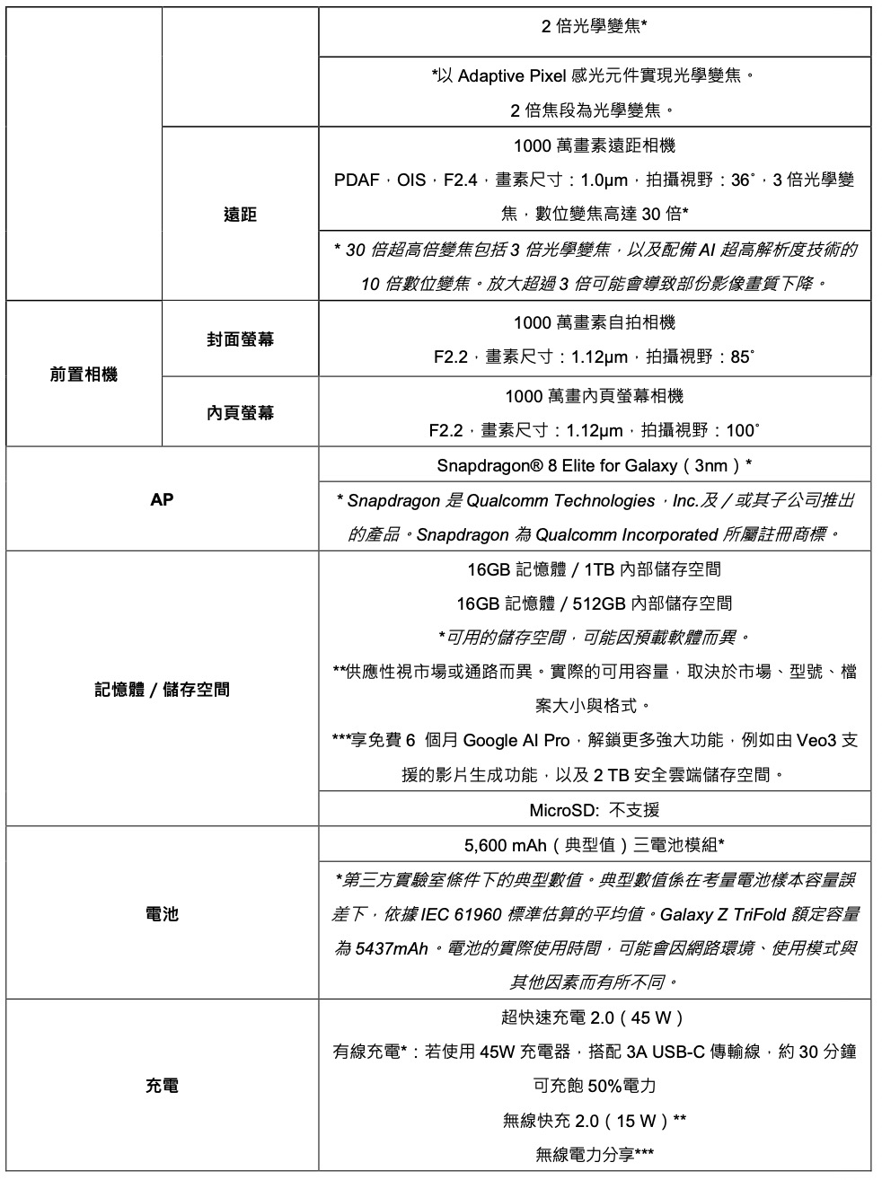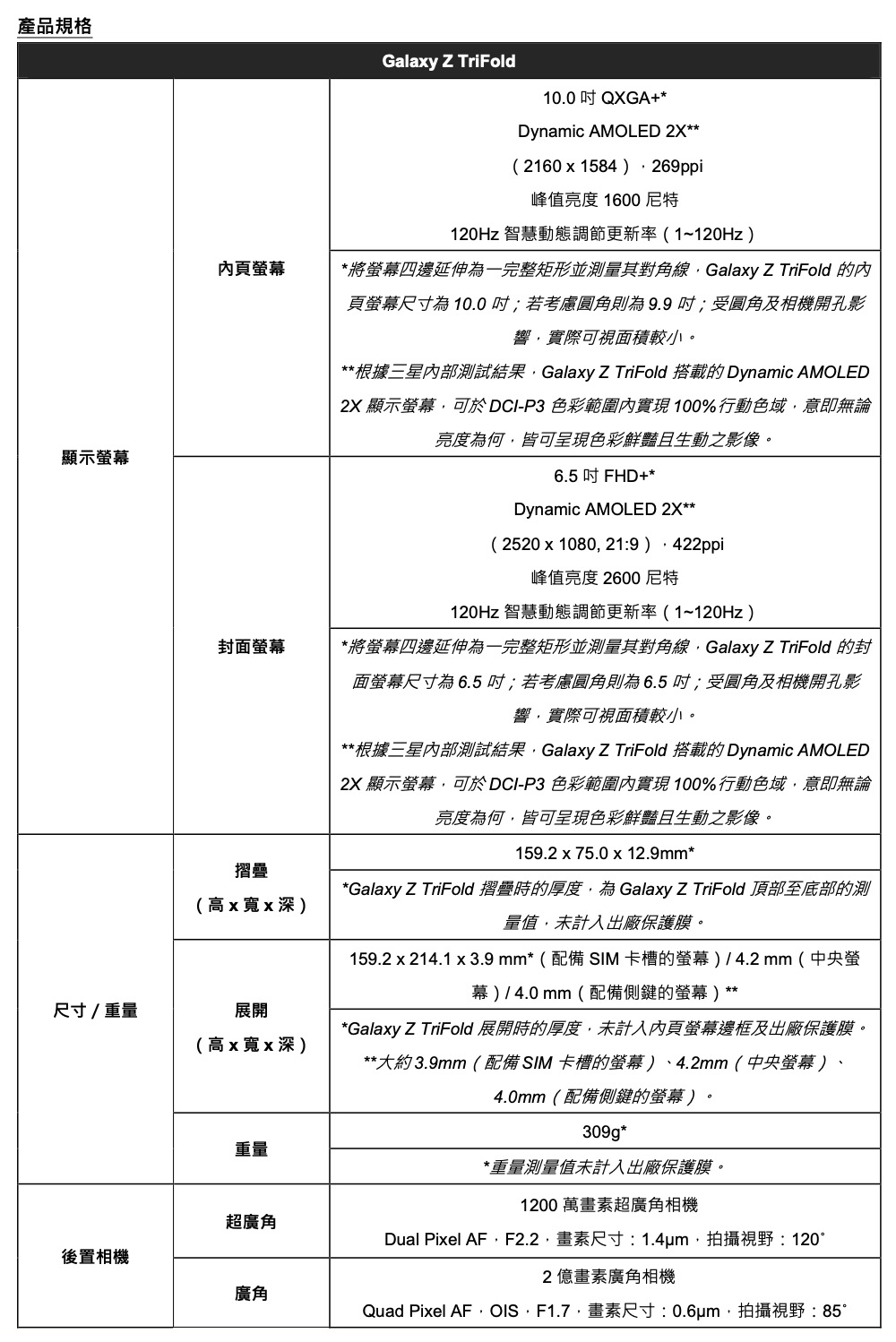Samsung Galaxy Z TriFold 搭載 10 寸 2160 x 1584 解析度 120Hz 更新率 Dynamic AMOLED 2X 內頁螢幕、6.5 寸 2520 x 1080 解析度 120Hz 更新率 Dynamic AMOLED 2X,峰值亮度分別為 1,600 / 2,600 尼特;配備 Qualcomm Snapdragon 8 Elite for Galaxy 晶片,搭配支援 2 倍光學變焦的 2 億畫素的主鏡頭、1,200 萬畫素超廣角鏡頭、1,000 萬畫素 3 倍長焦鏡頭,並有 1,000 萬畫素自拍鏡頭與 1,000 萬畫素內頁螢幕鏡頭。