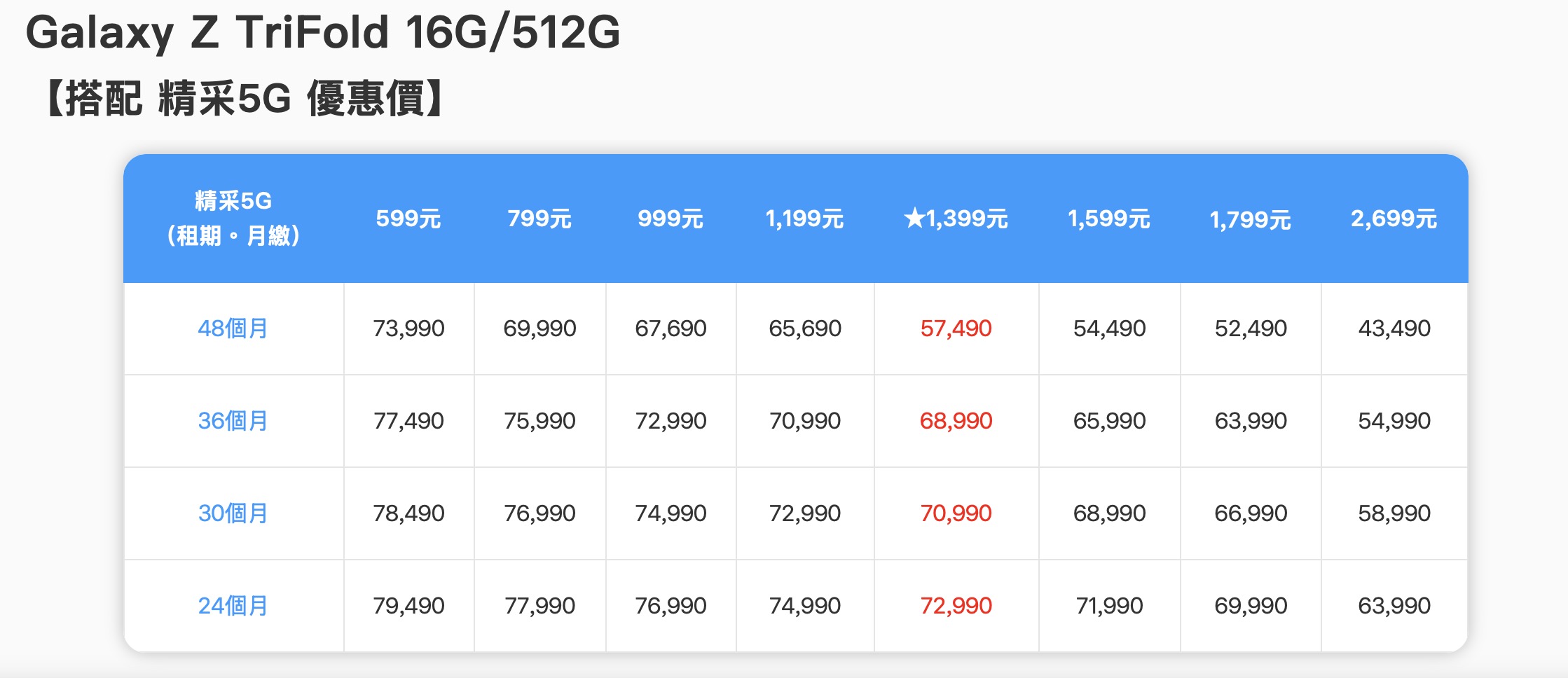三星(Samsung)旗下首款三摺疊手機 Galaxy Z TriFold 今(19)日在台開賣,中華電信、遠傳電信與台灣大哥大已紛紛祭出資費方案,然而這款旗艦新機的價格門檻相當驚人,即便消費者選擇綁約長達 48 個月 的 1,399 元高資費方案,購機價格仍高達新台幣 57,000 元左右,考驗星粉的荷包深度!