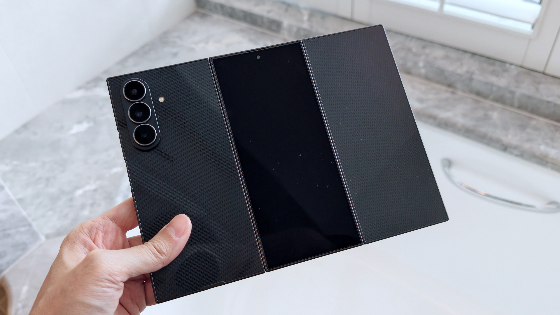 跟「友商」的摺疊設計不同,Samsung Galaxy Z TriFold 採用的是類似「G」型的摺疊設計,雖然只有摺疊與攤開兩種型態,沒有介於兩者之間的「中間尺寸」型態,但也因為這樣,這款手機在摺疊時可以完整保護那貴鬆鬆的內頁螢幕,個人是覺得還不賴;要注意的是,Samsung Galaxy Z TriFold 只有一個方向可以摺疊,摺錯方向手機會震動並在螢幕上提醒,只要別太暴力,不用擔心弄壞螢幕。