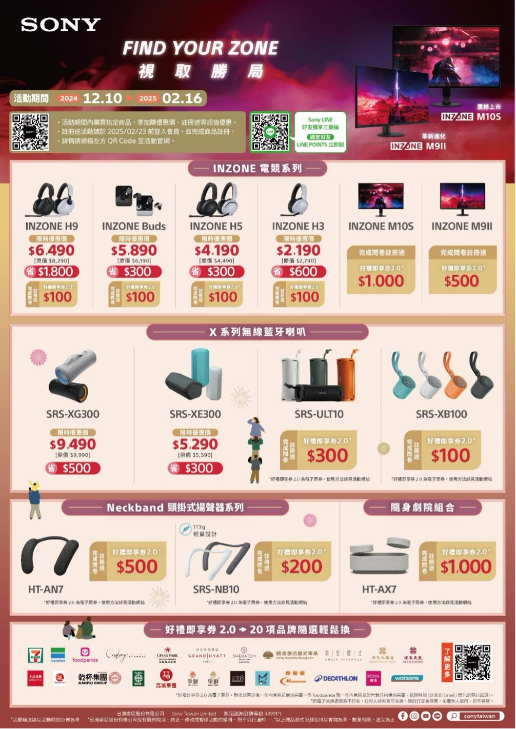 Sony 歲末優惠活動自即日起至 2025 年 2 月 16 日止登場,詳細活動訊息請參考官網活動網址,或洽詢全台 Sony 直營通路-Sony Store 台北遠百信義直營店、Sony Store 台北 101 直營店、Sony Store 台北復興直營店、Sony Store 台中直營店、Sony Store 高雄直營店、Sony 客服中心及各大消費性電子產品通路。