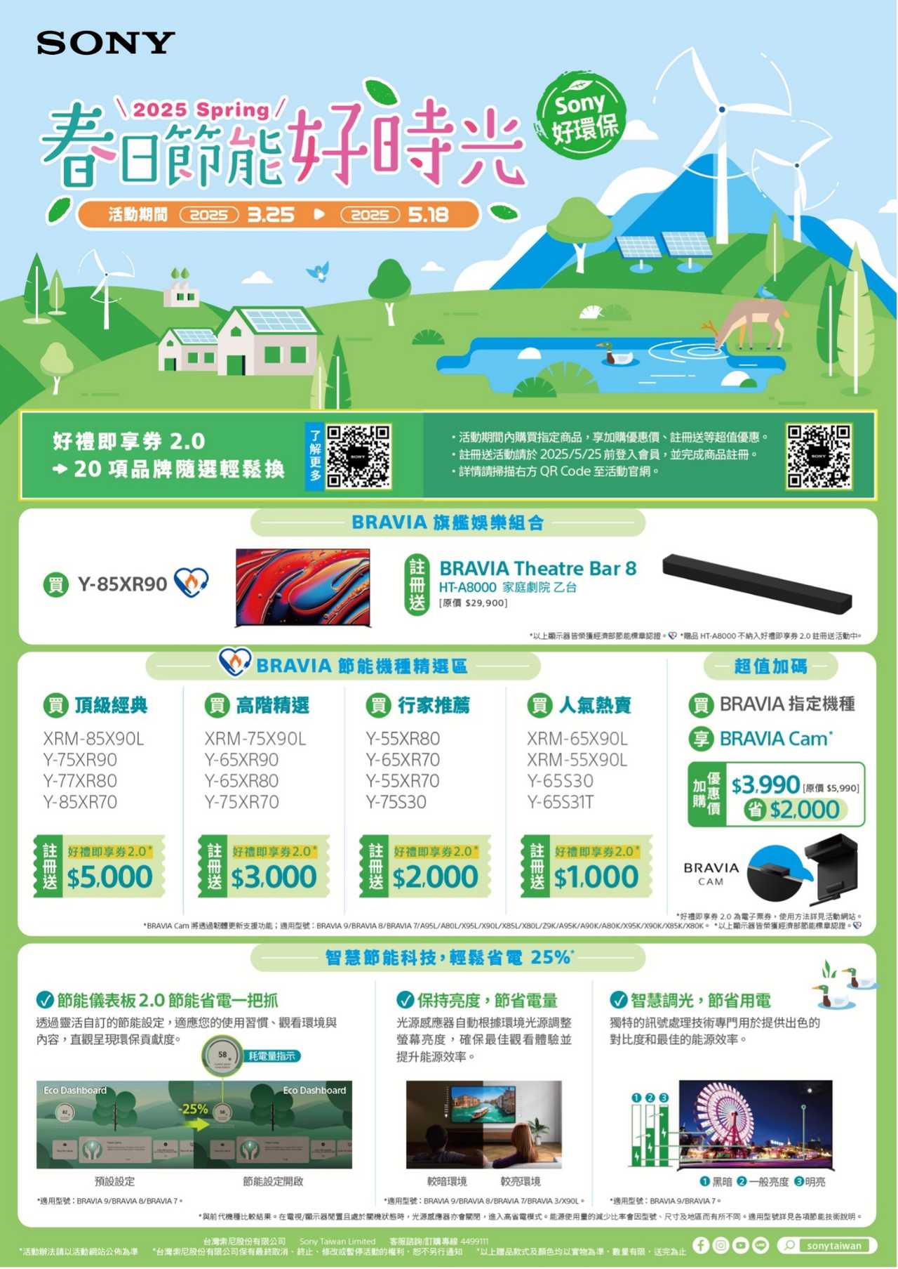 春日優惠活動期間選購 BRAVIA Y-85XR90 註冊即可獲得價值 29,900 元的 BRAVIA Theatre Bar 8 家庭劇院,選購 BRAVIA 熱門指定機種,完成註冊亦可享最高 5,000 元好禮即享券的超值回饋;另外,BRAVIA 指定機種加購 BRAVIA Cam 即可現折 2,000 元。