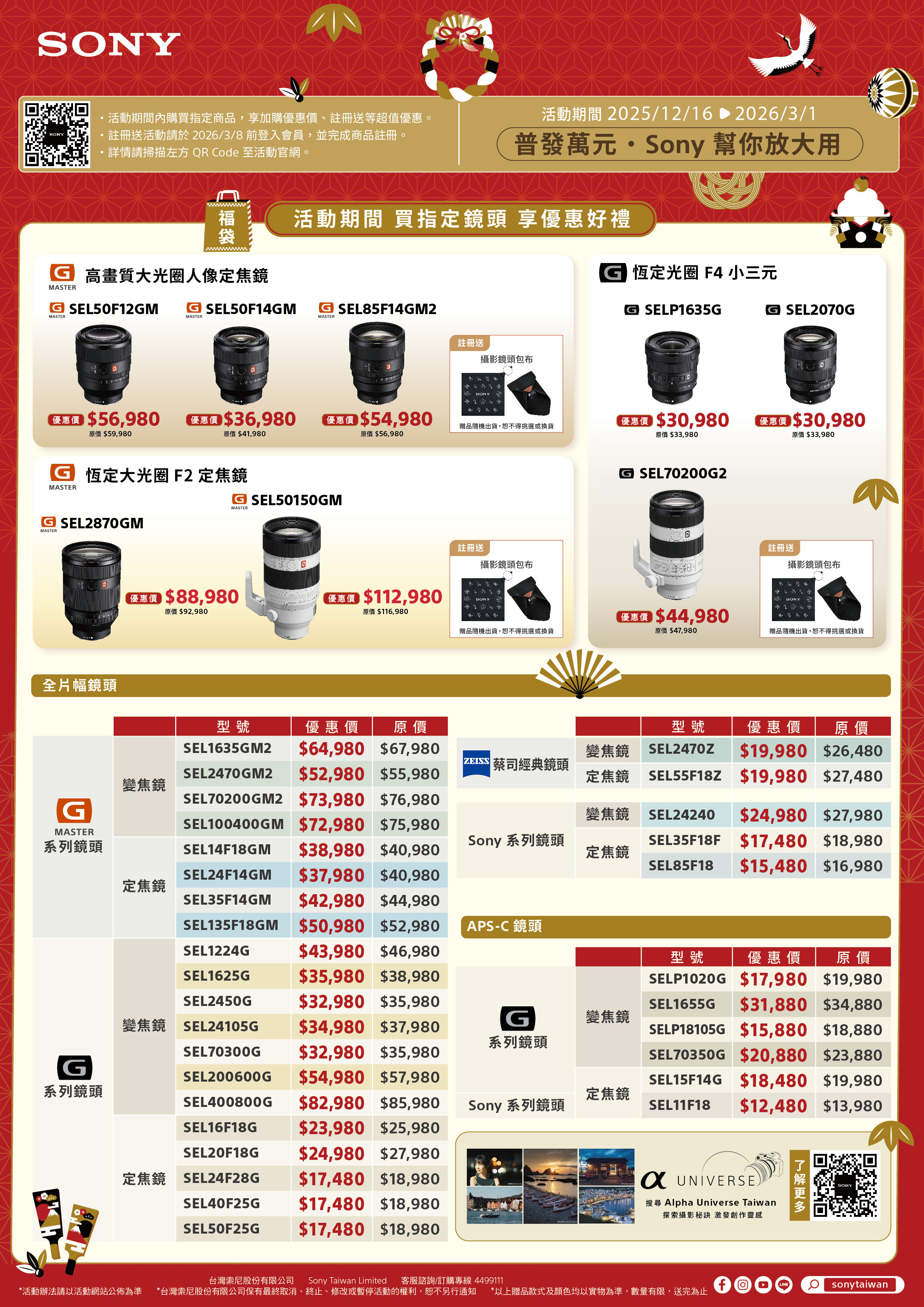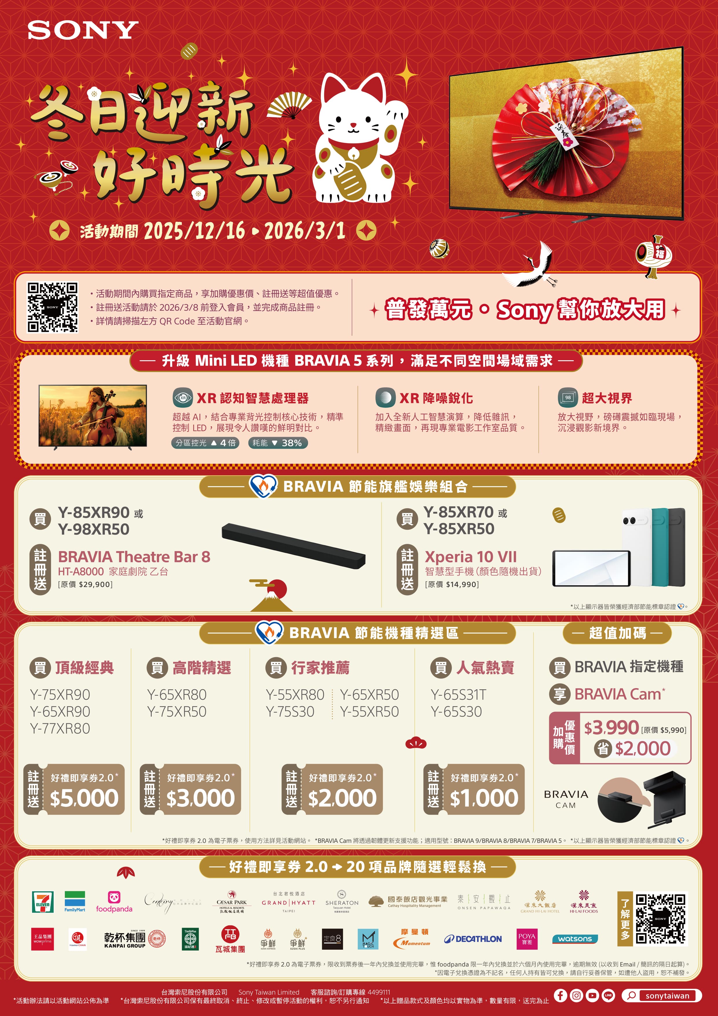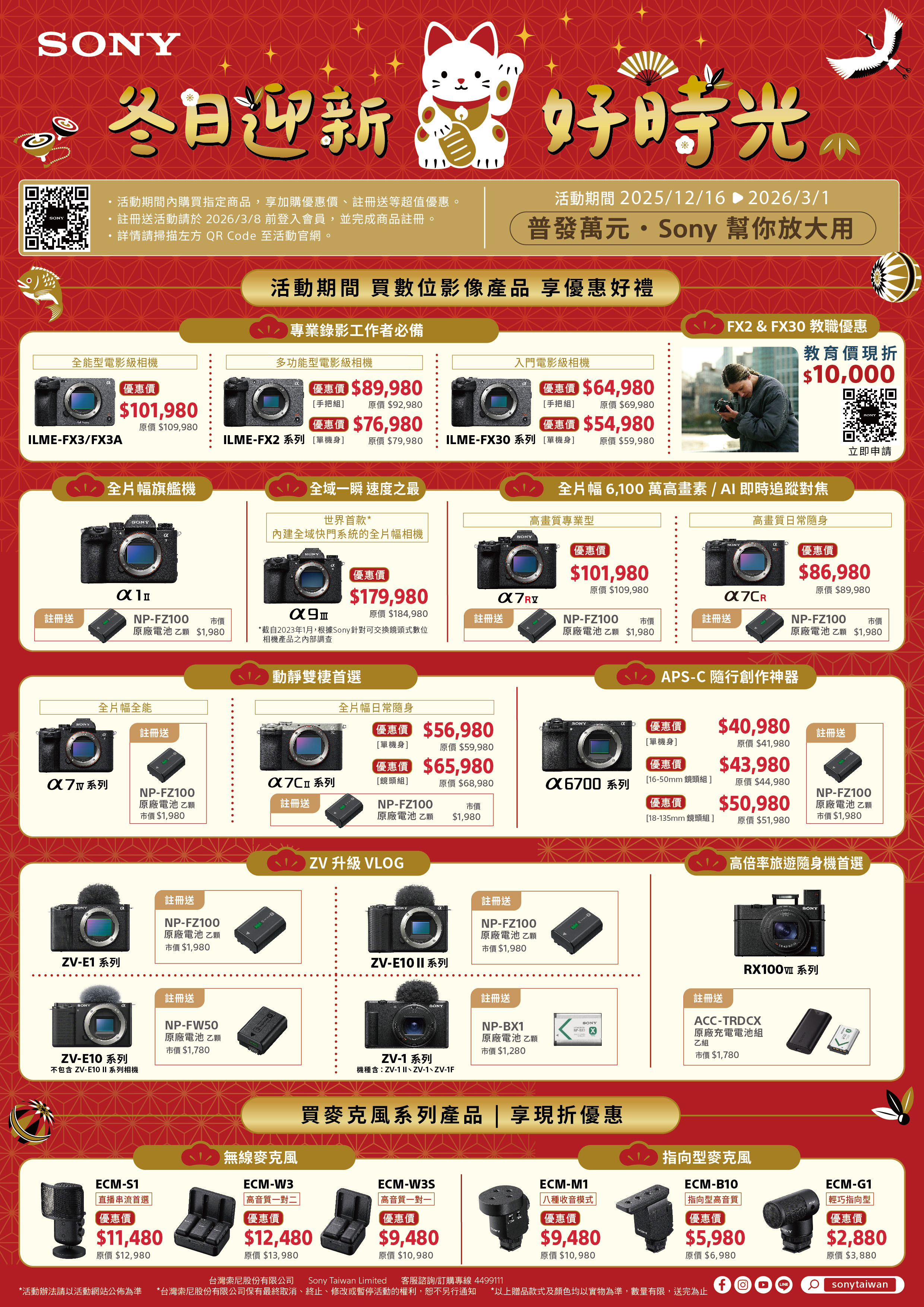 Sony 冬日迎新優惠活動即日起至 2026 年 3 月 1 日截止,詳細活動訊息可參考官方活動網頁,或洽詢全台 Sony 直營通路及各大消費性電子產品通路。