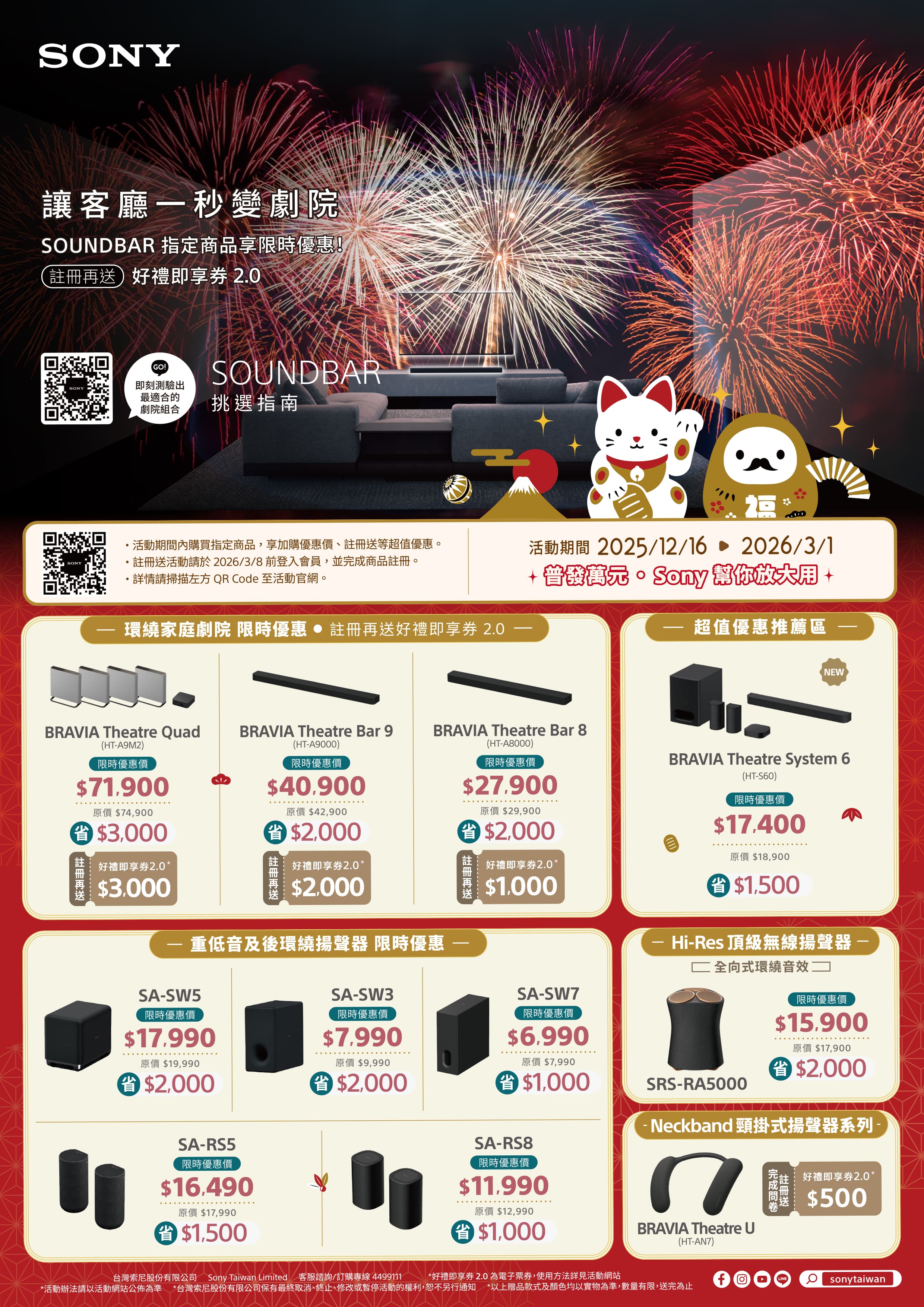 家庭劇院產品亦推出現抵優惠價並加碼註冊好禮,選購 HT-A9M2、A9000、A8000 及 BRAVIA Theatre System 6 套組最高折抵 3,000 元,註冊再送最高回饋 3,000 元好禮即享券;SA-SW5、SW3、SW7 無線重低音揚聲器和 SA-RS5、RS8 無線後環繞揚聲器,則推出最高現省 2,000 元的限時優惠價格。