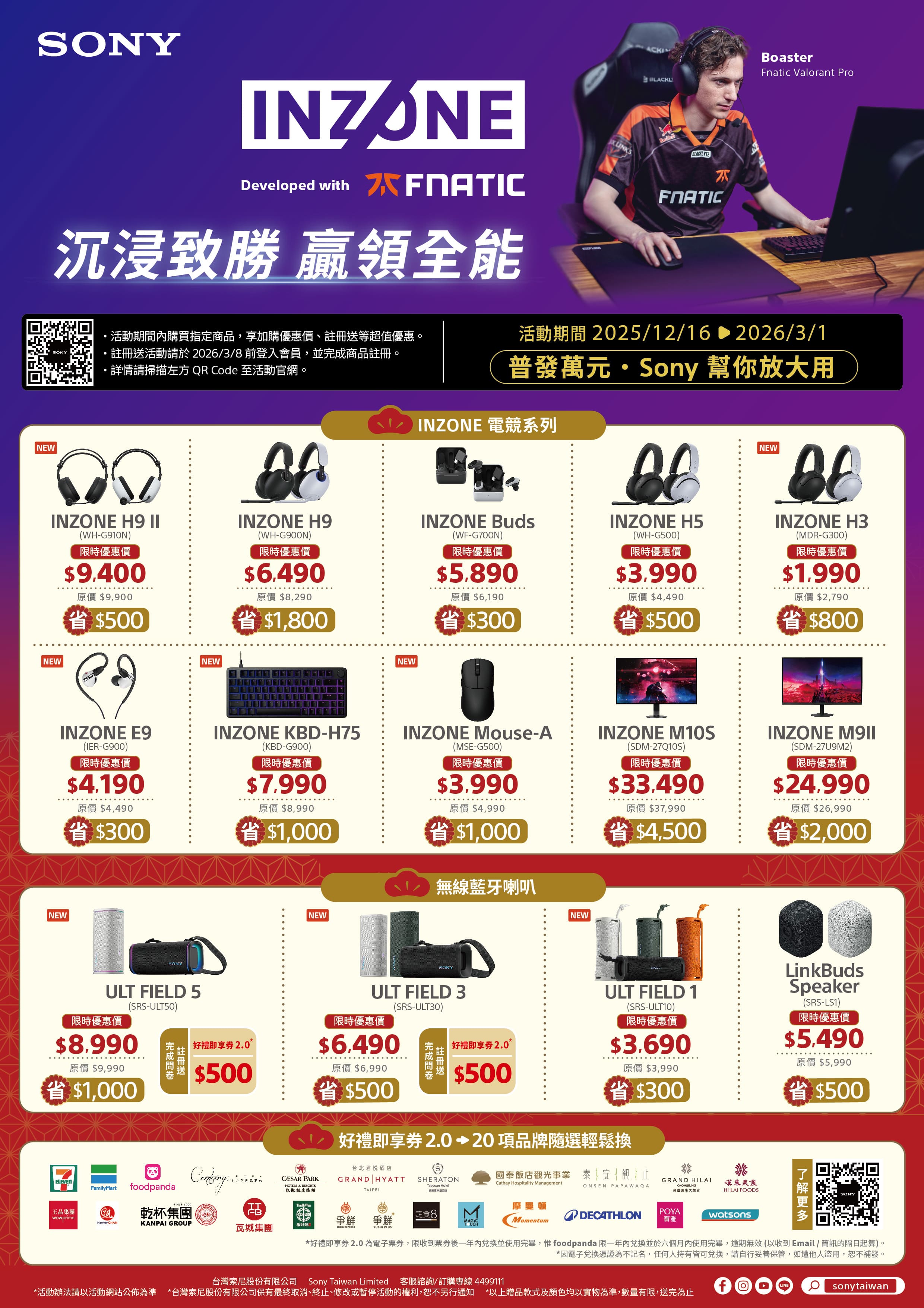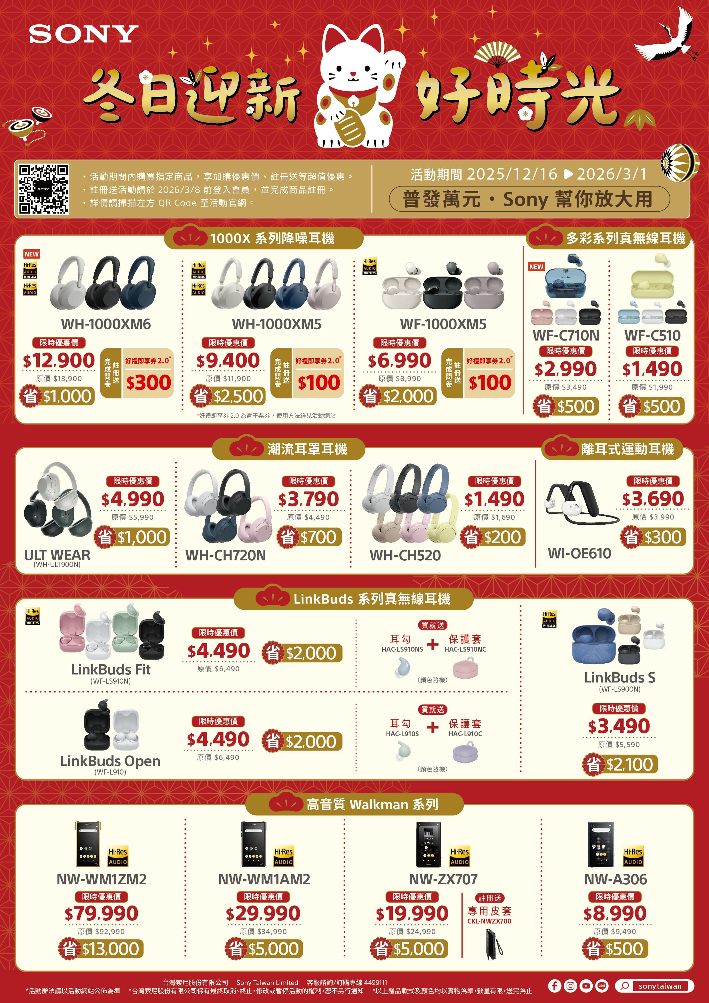 Sony Taiwan 即(16)日起至 2026 年 3 月 1 日推出冬日迎新優惠活動,針對旗下全系列產品祭出多重限時回饋!