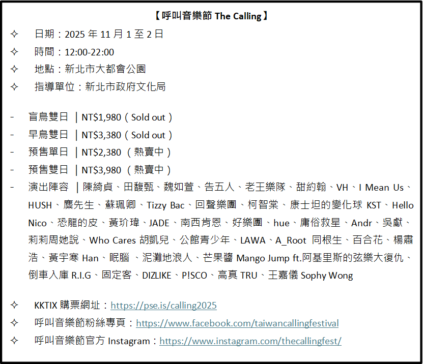 2025 呼叫音樂節將於 11 月 1 日至 2 日登場,2025 年首次回歸台灣舉辦,以「不只聽歌」為主題,將音樂、藝術、美食與潮流融為一體,化身為一座充滿創意能量的城市嘉年華。