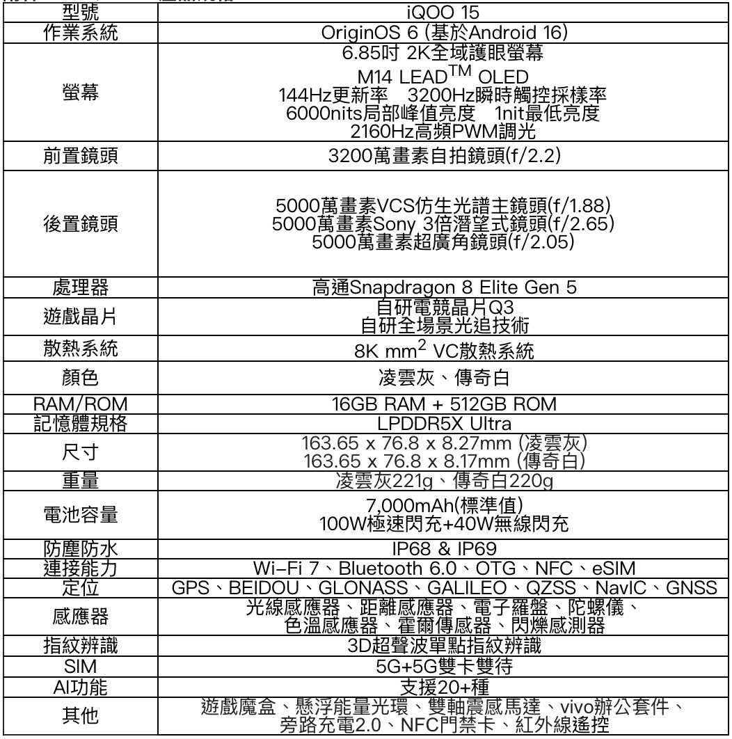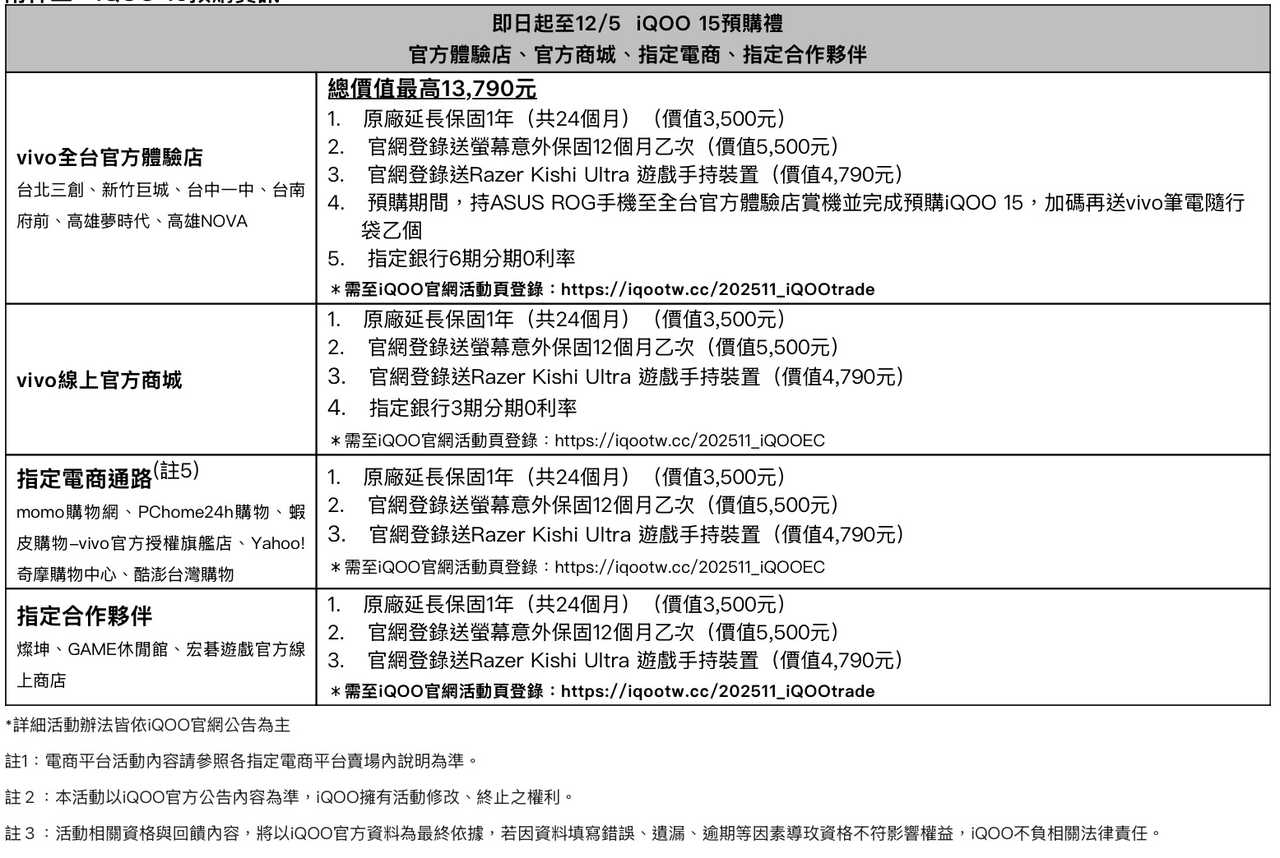 iQOO 15 提供「凌雲灰」與「傳奇白」兩款配色,規格為 16GB + 512GB,建議售價新台幣 29,999 元;即日起至 2025 年 12 月 5 日於 vivo 官方體驗店、線上商城、燦坤、宏碁遊戲官方商店等指定通路預購,即享一年延長保固、Razer Kishi Ultra 遊戲手柄與 12 個月螢幕意外保固,總價值達 13,790 元,預計 12 月 6 日 全台通路正式開賣。