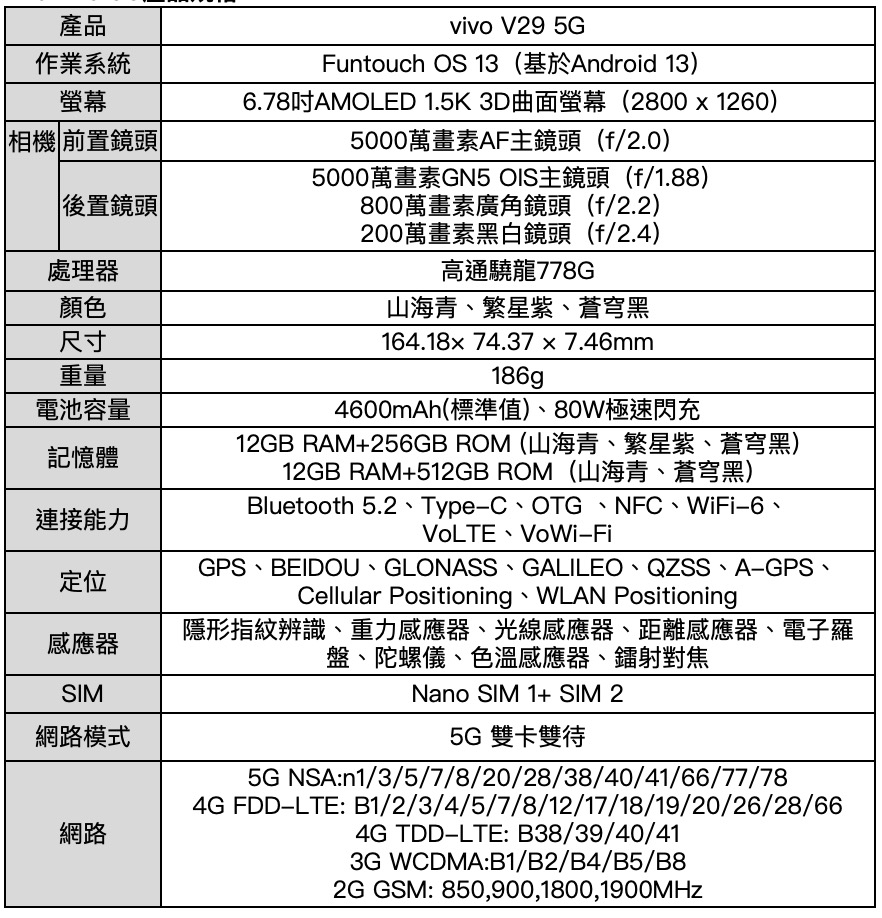 vivo V29 5G 將 3D 粒子水墨工藝融入手機外觀,採用 6.78 吋 1.5K 解析度 AMOLED 曲面大螢幕,支援 120Hz 螢幕更新率,內建 Qualcomm Snapdragon 778G 處理器,記憶體提供 12GB RAM + 256GB ROM(山海青、繁星紫、蒼穹黑)/ 12GB RAM + 512GB ROM(山海青、蒼穹黑)兩種組合,並支援 8GB 額外擴充 RAM,電池容量 4,600mAh,支援 80W 極速充電。