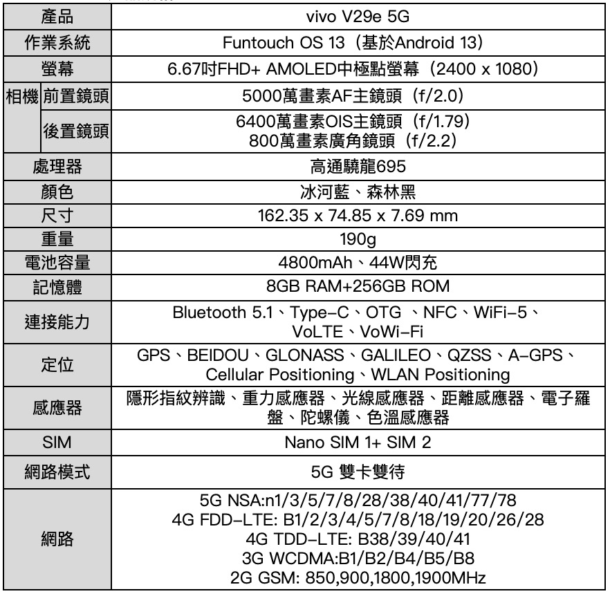 vivo V29e 5G 則採用 6.67 吋 FHD+ AMOLED 中極點螢幕、120Hz 螢幕更新率,以及 150% 大音量,內建 Qualcomm Snapdragon 695 處理器、8GB RAM + 256GB ROM,電池容量 4,800mAh,支援 44W 閃充;主相機採用 6,400 萬畫素 F1.79 光圈 OIS 主鏡頭、800 萬畫素 F2.2 光圈廣角鏡頭,前相機為 5,000 萬畫素 F2.0 光圈 AF 主鏡頭;冷暖柔光環除了有感提升人像拍攝體驗,美食模式亦內建鮮明、柔和、暖色及冷色四種美食風格強化成像,並可透過 AI 智慧演算法提升拍攝效能,呈現自然的虛化背景,增加畫面立體感。