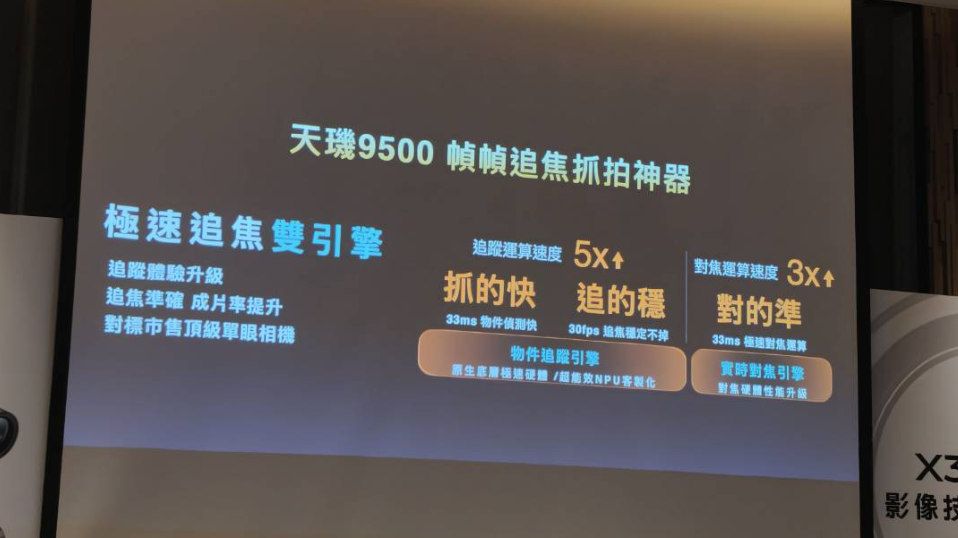李俊男透露,聯發科首次採取團隊駐廠共研模式,與 vivo 一起定義使用場景、運算流程與能效協作,因此才能讓影像運算延遲從 150ms 大幅壓縮至 33ms;天璣 9500 還導入跨代功耗管理與硬體級算圖加速引擎,使 X300 Pro 能穩定拍攝 4K 120fps Dolby Vision。