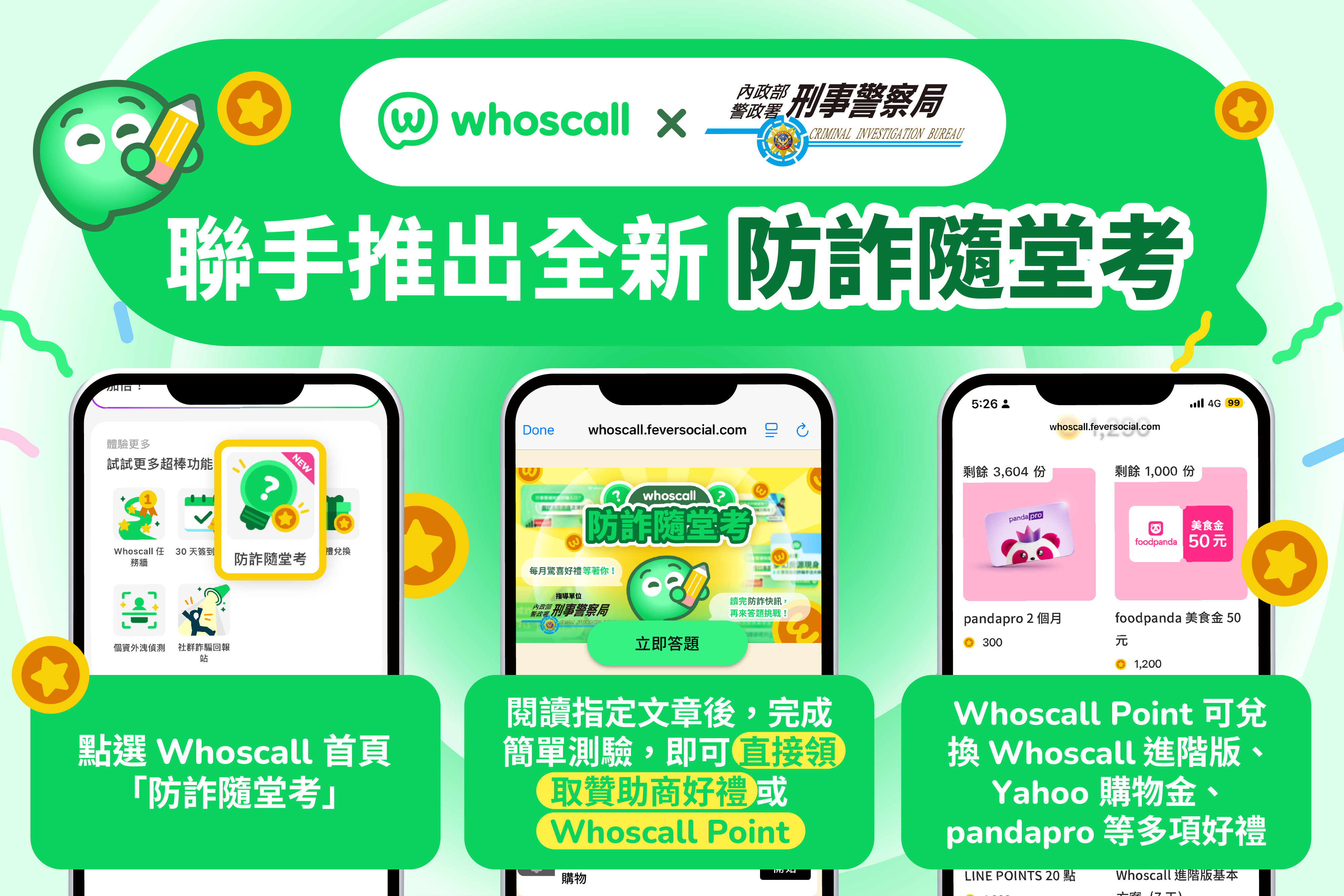 在 Whoscall App 中,民眾只需點入 Whoscall 首頁的「防詐隨堂考」,並閱讀指定防詐快訊後,完成頁面中的小測驗,即可累積 Whoscall Points;累積的 Whoscall Points 可兌換 LINE Points、foodpanda 美食金、Yahoo 奇摩購物金等獎項,Whoscall 期望透過「遊戲化學習」與「獎勵機制」,讓識詐教育變得更輕鬆,讓民眾也更願意主動參與與分享。